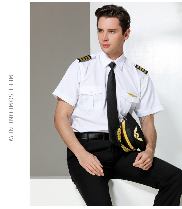 เครื่องแบบการบินฤดูร้อนของผู้ชายเสื้อทำงานกัปตันแขนยาวสีขาวชุดนักบินนักเรียนนายร้อย