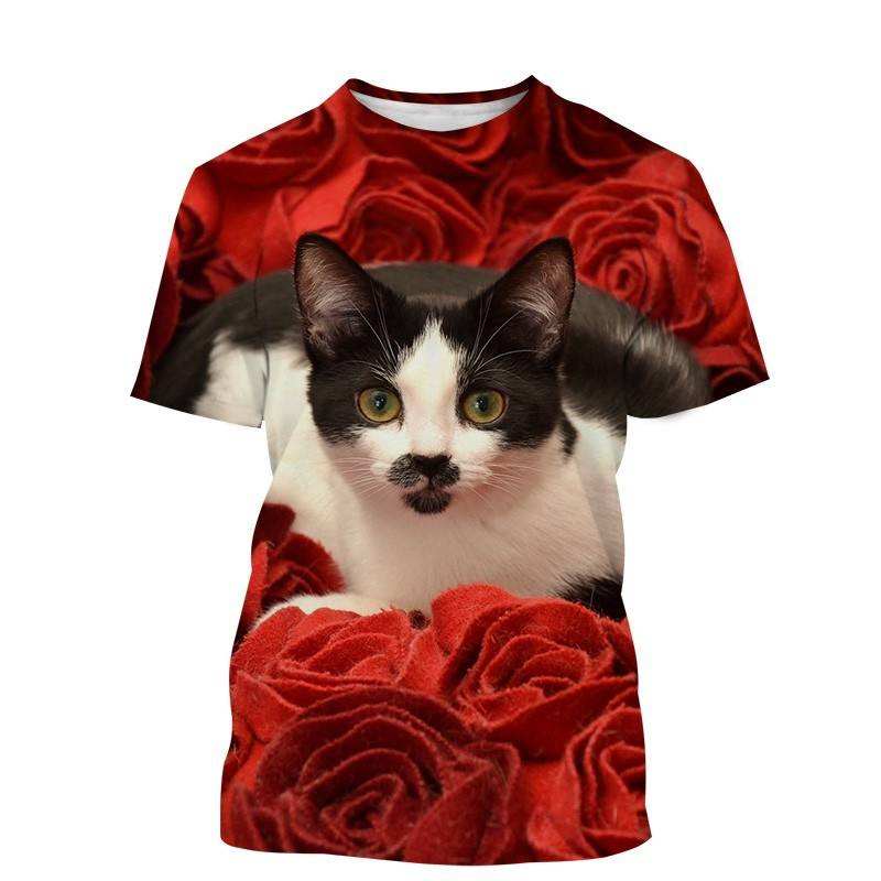 เสื้อยืดแขนสั้นคอกลมพิมพ์ลาย 3 มิติ สไตล์ลำลองสำหรับผู้ชาย ใส่สบาย ระบายอากาศได้ดี ไซส์ใหญ่ ลายแมวน่ารัก ดอกไม้ สไตล์ธรรมชาติ