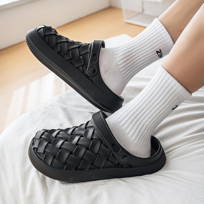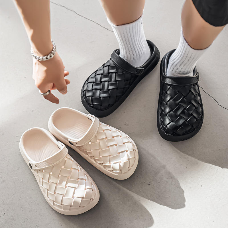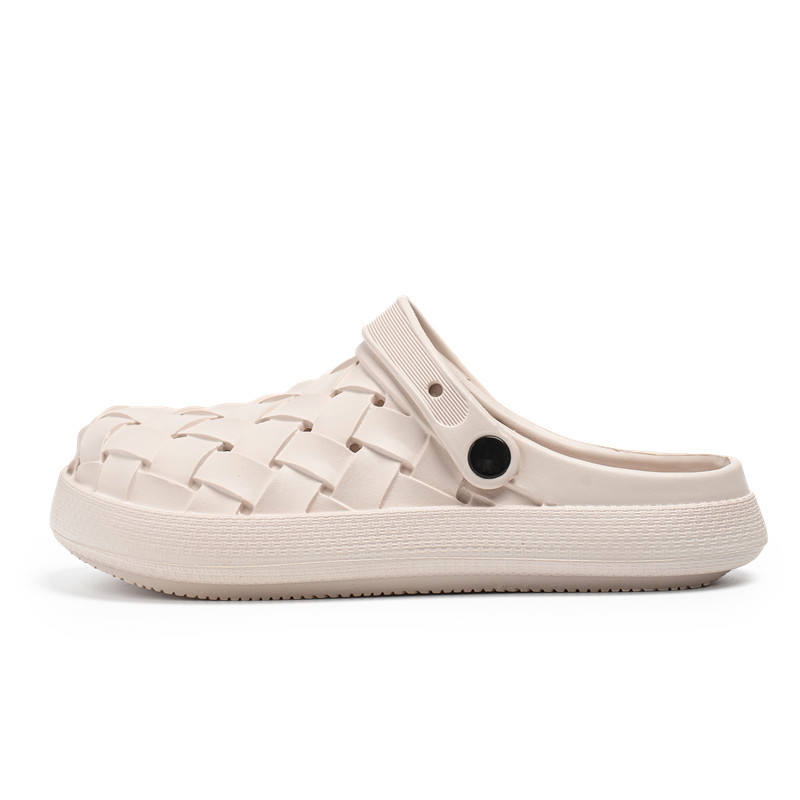 รองเท้าแตะผู้ชายแบบสวมใส่สบายสำหรับฤดูร้อน วัสดุ PVC ระบายอากาศ พื้นรองเท้า EVA หนา สไตล์ลำลองชายหาด รุ่น 8810 สีเบจและสีดำ