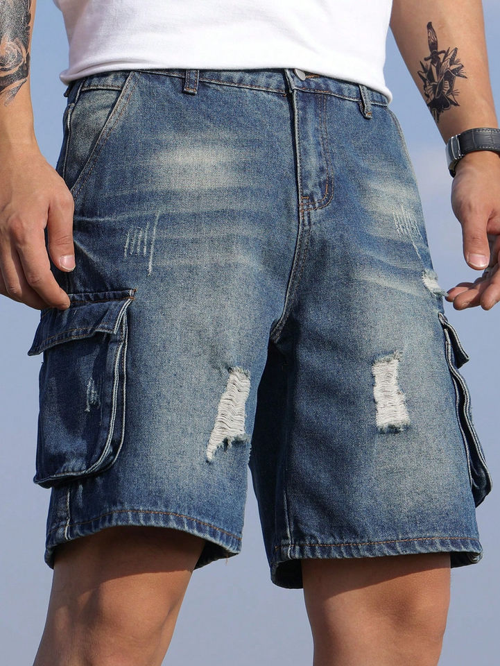 กางเกงยีนส์ขาสั้นทรงคาร์โก้สำหรับผู้ชายกางเกงขาสั้นแบบลำลองมีรอยขาดหลายกระเป๋าผ้าคอตตอนสีล้วนมีรูสำหรับฤดูร้อน