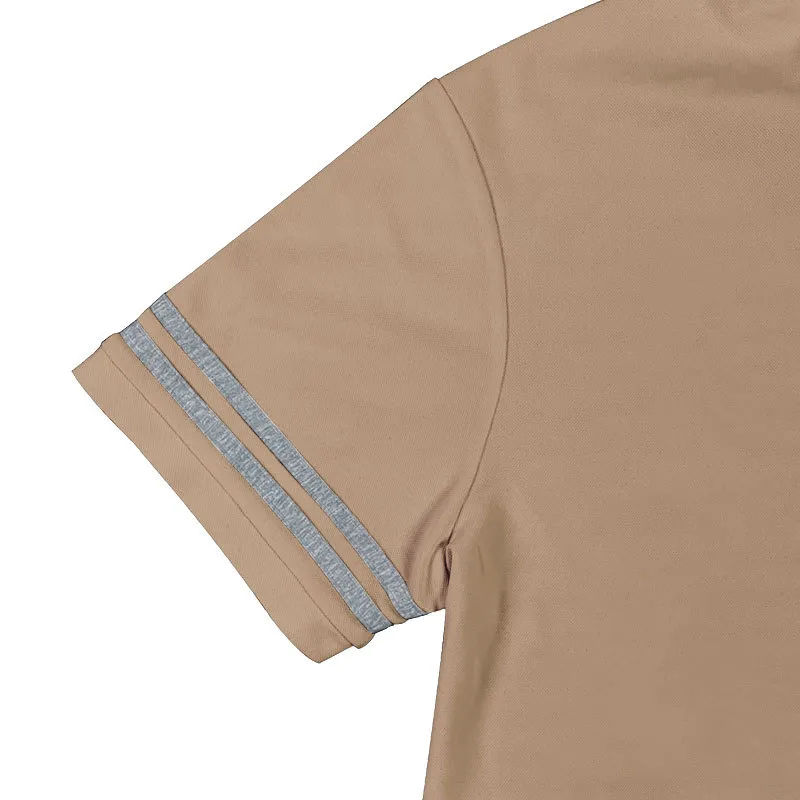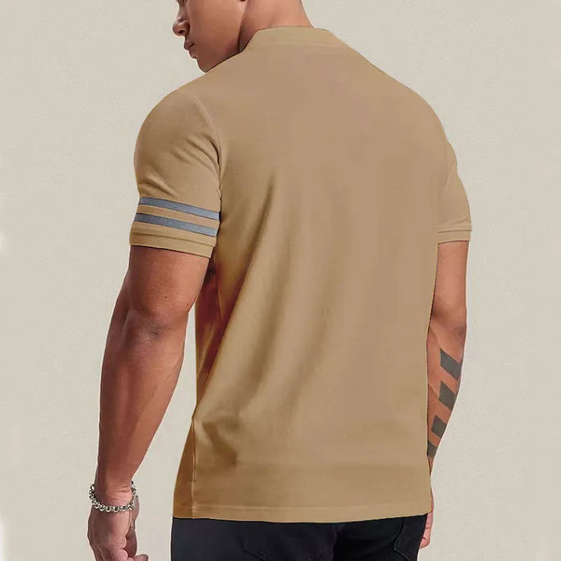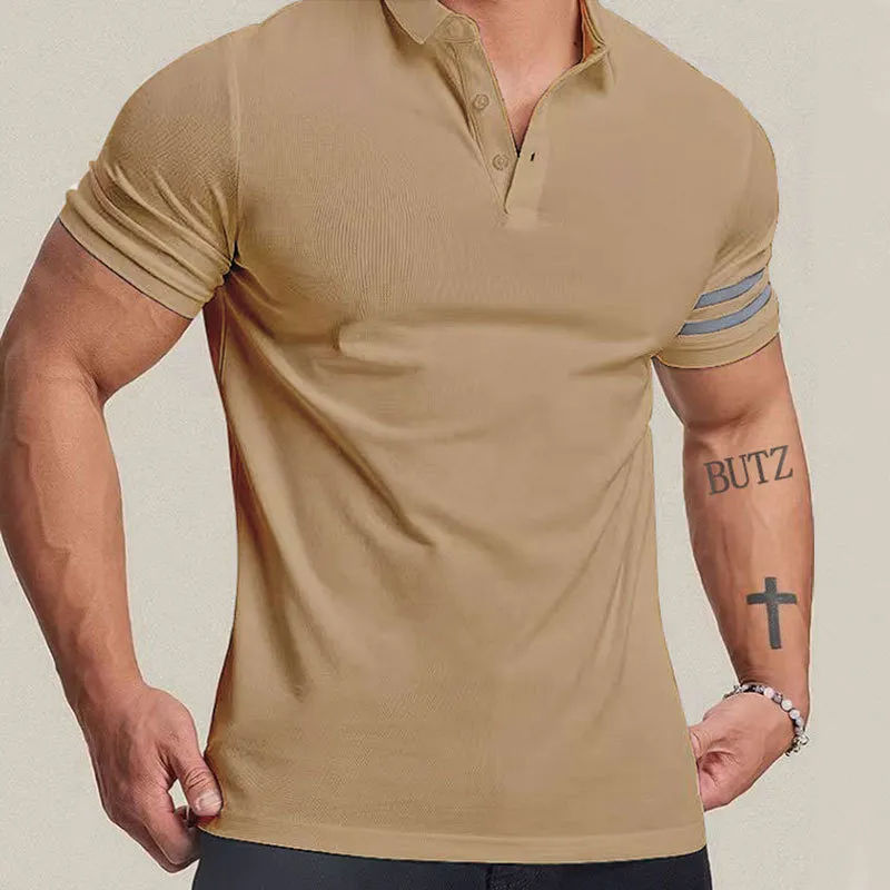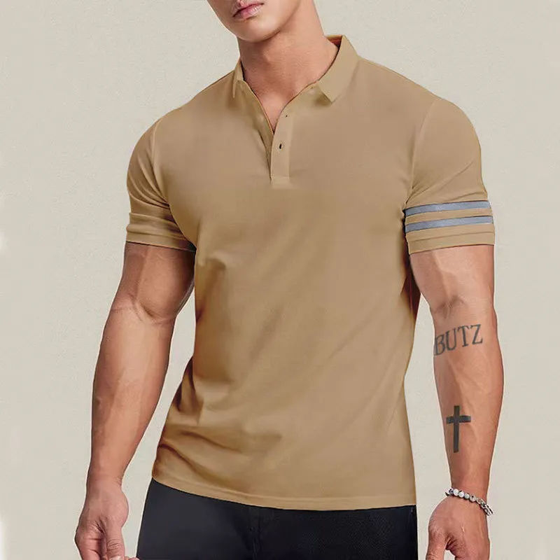 เสื้อยืดผู้ชายฤดูร้อนสีพื้นแขนสั้นเข้ารูปกอล์ฟสำหรับโปโลลายทางผ้าถักปกสองชั้น