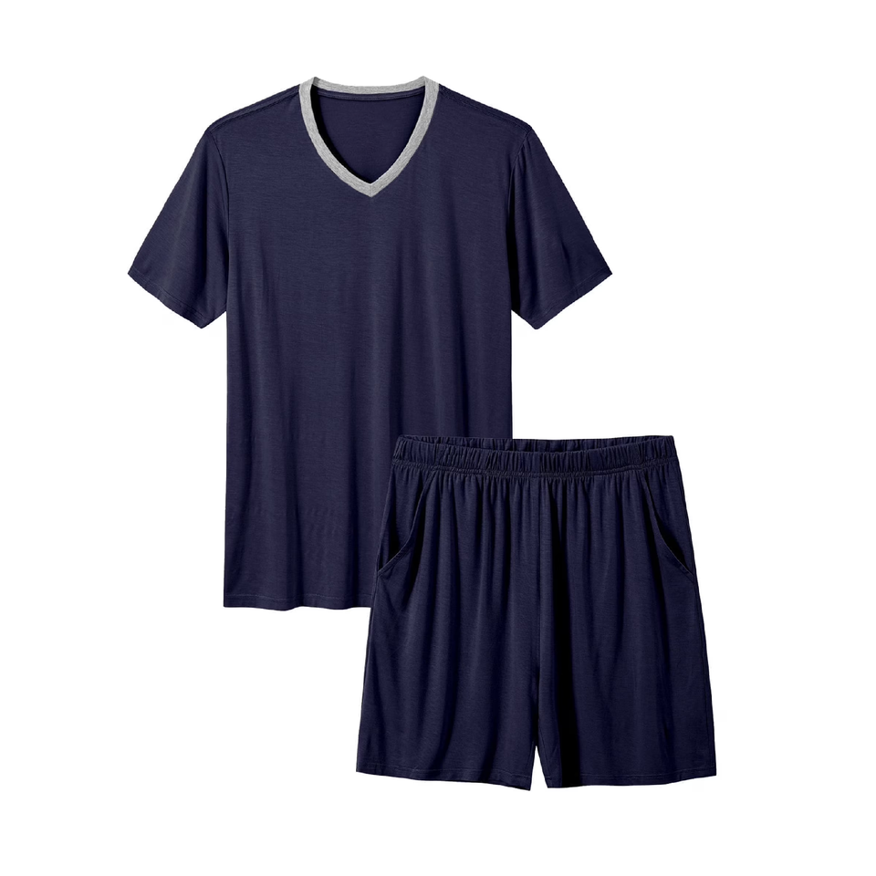 ชุดเสื้อยืดกางเกงขาสั้นฤดูร้อนสำหรับผู้ชาย ออกแบบเองได้ คอวี แขนสั้น ผลิตจากโพลีเอสเตอร์/สแปนเด็กซ์ เป็นมิตรกับสิ่งแวดล้อม สีน้ำเงินกรมท่า แบรนด์ BD แบบกำหนดเอง