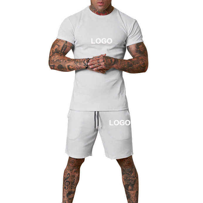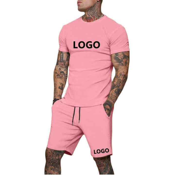 ชุดเสื้อยืดและกางเกงขาสั้นสำหรับผู้ชายชุดกางเกงขาสั้นผ้าคอตตอนแบบสองชิ้นสำหรับใส่100% และกางเกงขาสั้นออกแบบโลโก้ได้ตามที่ต้องการ