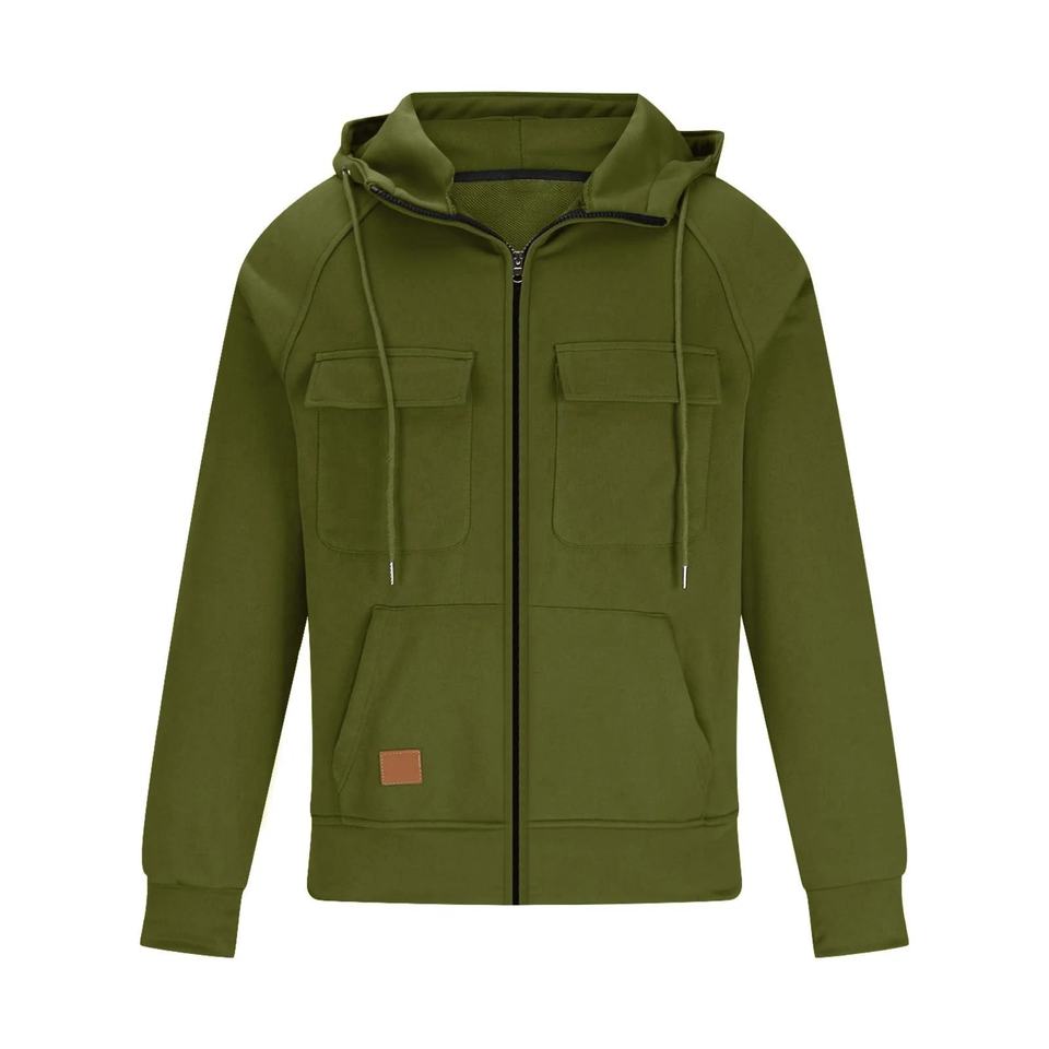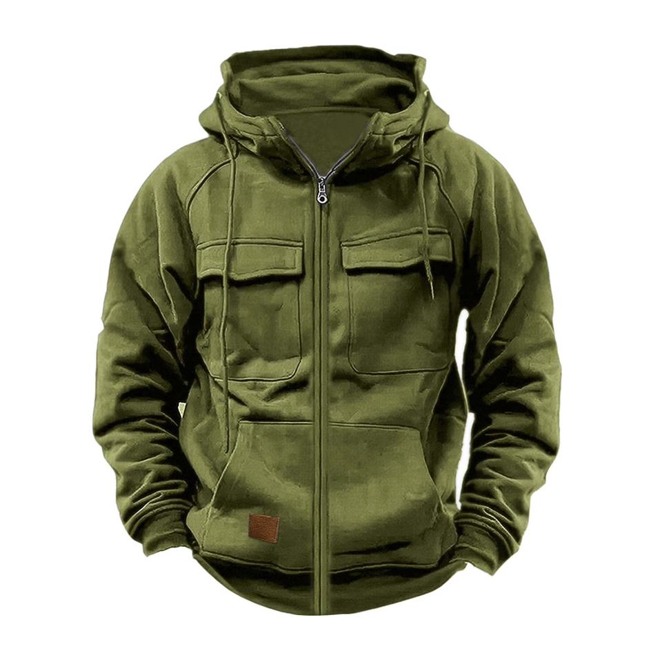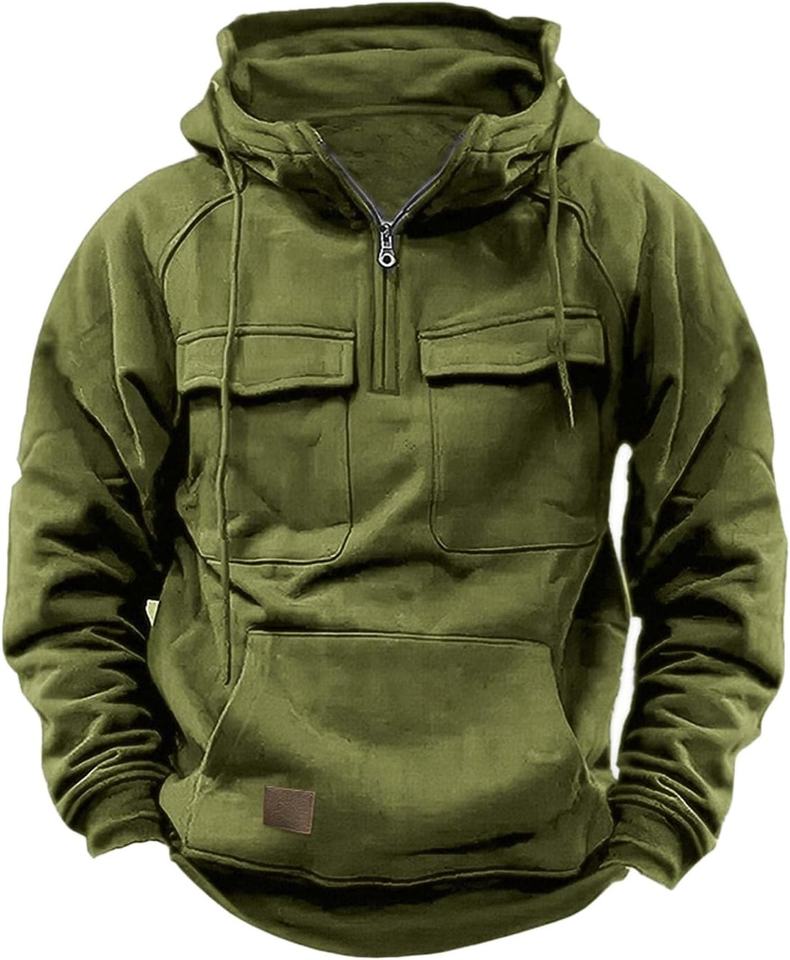เสื้อฮู้ดดี้ผู้ชายสไตล์ทหาร ผ้าเดนิม 100% คอตตอน ซักแล้ว สีพื้น ทรงโอเวอร์ไซส์ มีกระเป๋าคาร์โก้และฮู้ด