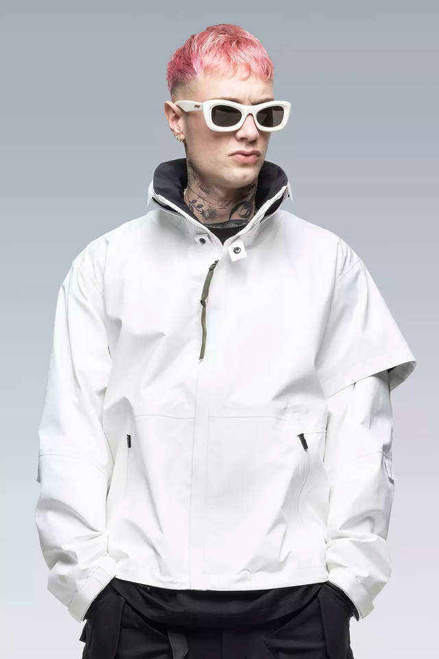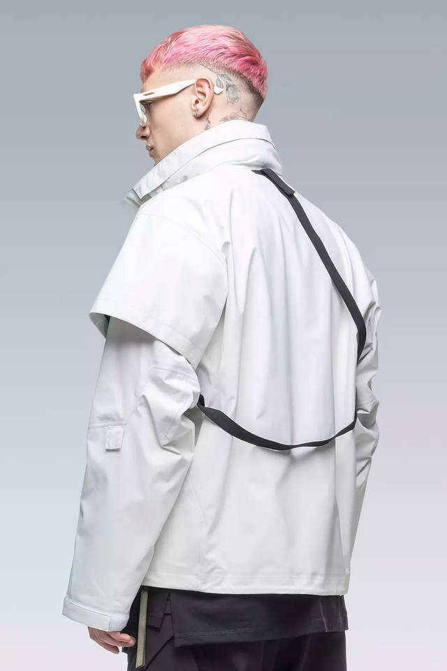 เสื้อแจ็คเก็ตเทคแวร์ผู้ชายสีขาว สไตล์ฟิวเจอร์ริสติก ไซเบอร์พังก์ สตรีทแวร์ กันลม แนวแทคติคอล คาร์โก้ ฟังก์ชันแนล เสื้อคลุมอเนกประสงค์สำหรับคนเมือง
