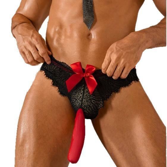 กางเกงในชายแบบ Thong เอวต่ำ ผ้าลูกไม้ ระบายอากาศดี เซ็กซี่ ผลิตจากโพลีเอสเตอร์ ซักมือ ดูแลรักษาง่าย พร้อมที่แยกอวัยวะเพศชาย ทรงจมูกช้าง