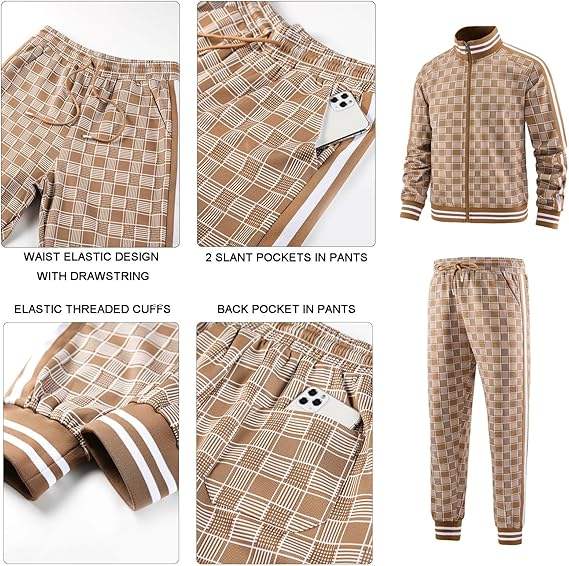 ชุดวอร์มผู้ชายแบบซิปเต็มตัว แขนยาว ลายสก็อต เสื้อแจ็คเก็ตและกางเกงขายาว 2 ชิ้น