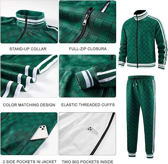 ชุดวอร์มผู้ชายแบบซิปเต็มตัว แขนยาว ลายสก็อต เสื้อแจ็คเก็ตและกางเกงขายาว 2 ชิ้น