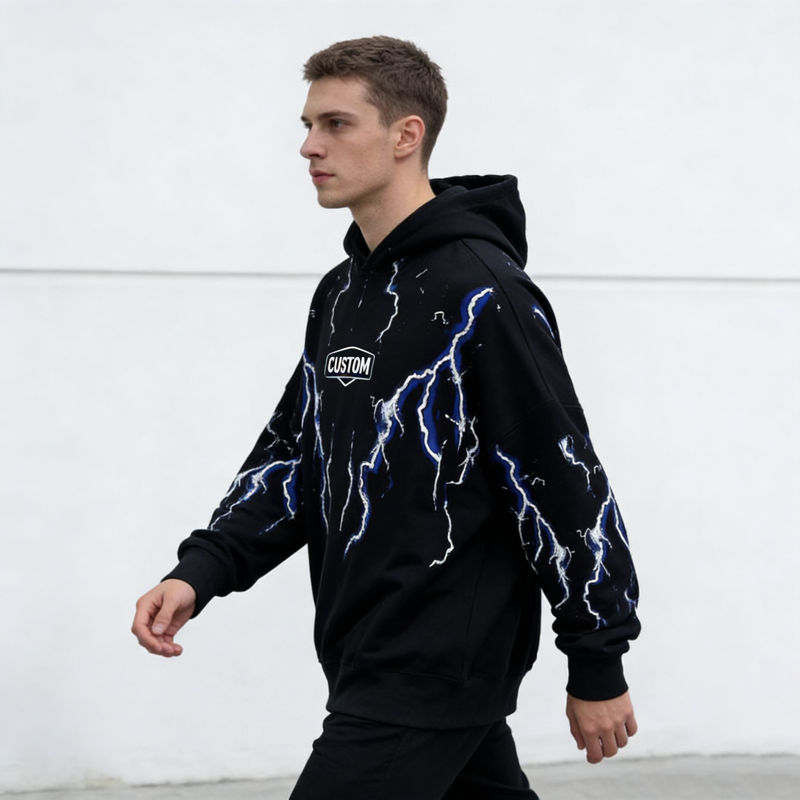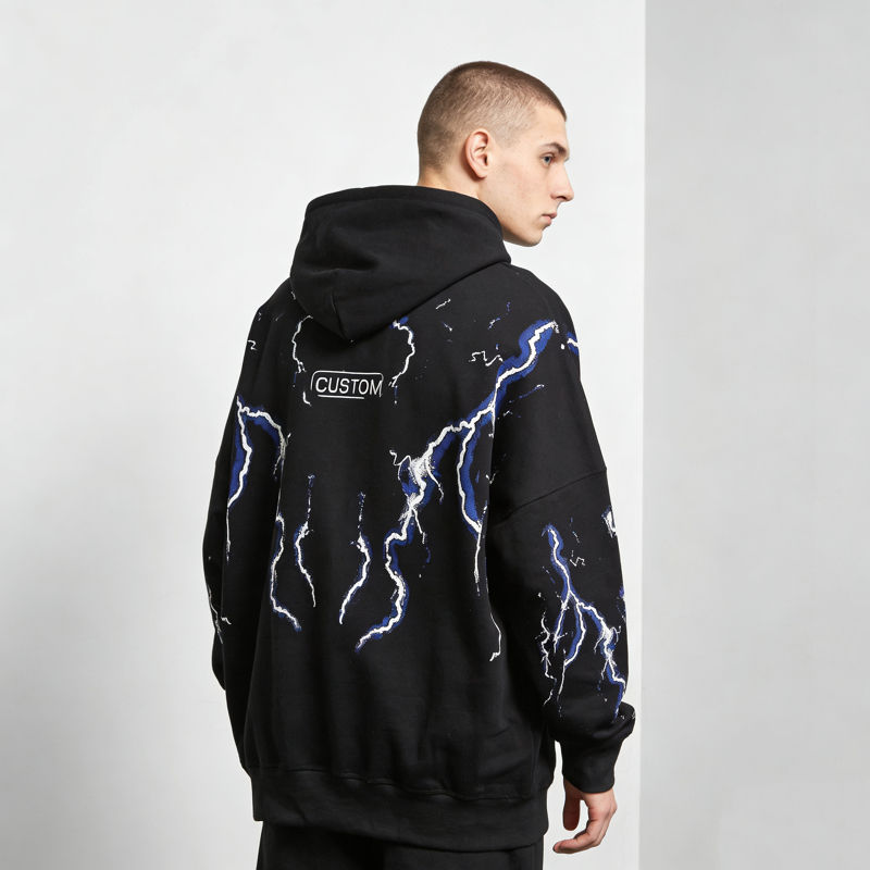 เสื้อฮู้ดดี้พิมพ์ลายสายฟ้าสีดำเทรนดี้สำหรับผู้ชาย สไตล์สตรีทแวร์ทรงโอเวอร์ไซส์ ผ้าฝ้าย พิมพ์ลายโลโก้ตามสั่ง ใส่สบายๆ