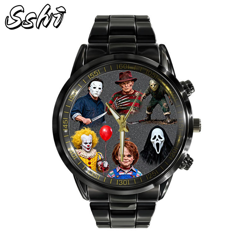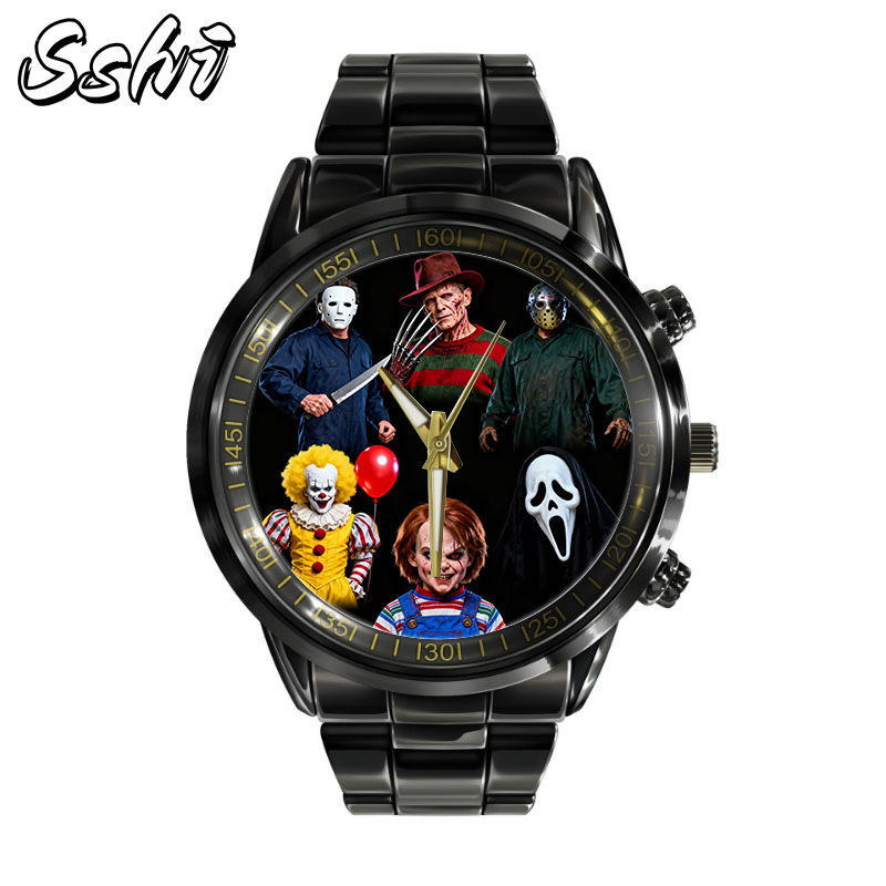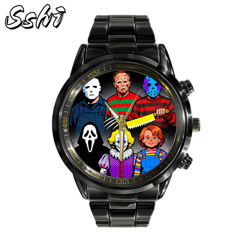 นาฬิกาข้อมือควอตซ์สายเหล็กทันสมัยสำหรับผู้ชายนาฬิกาข้อมือทำจากหนังสยองขวัญที่กำหนดเองตัวละครต่อพ่วงสำหรับการค้าต่างประเทศโลหะผสม