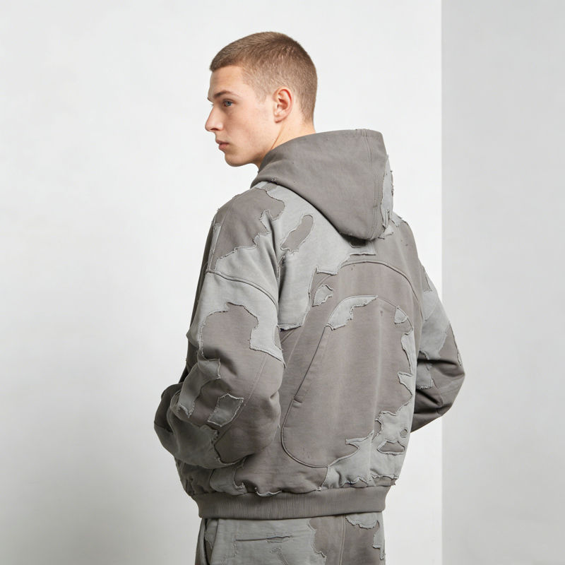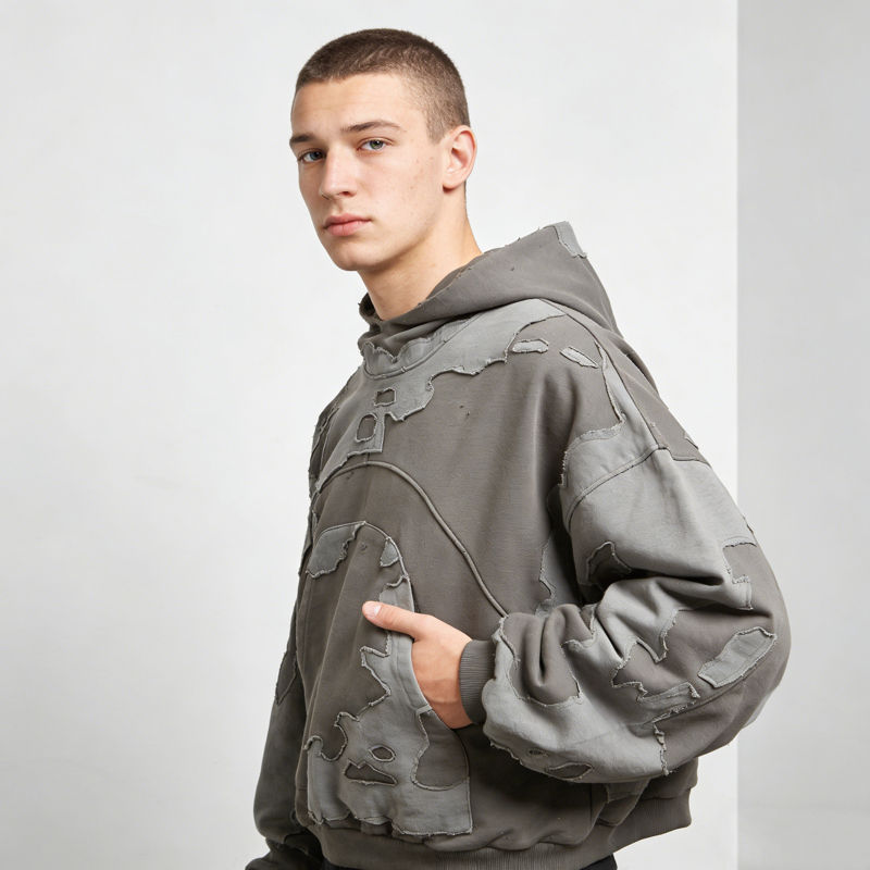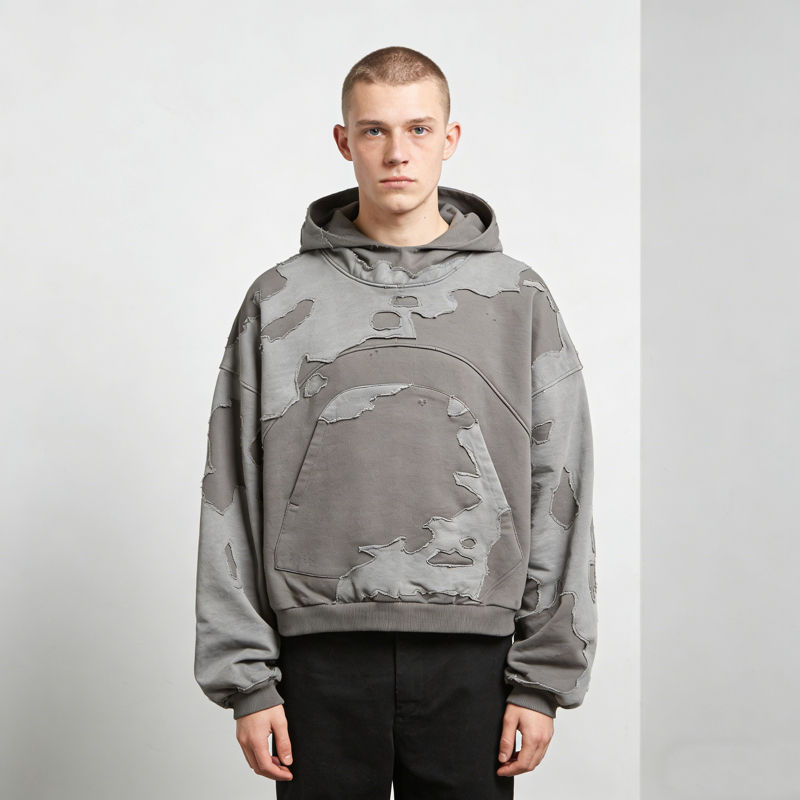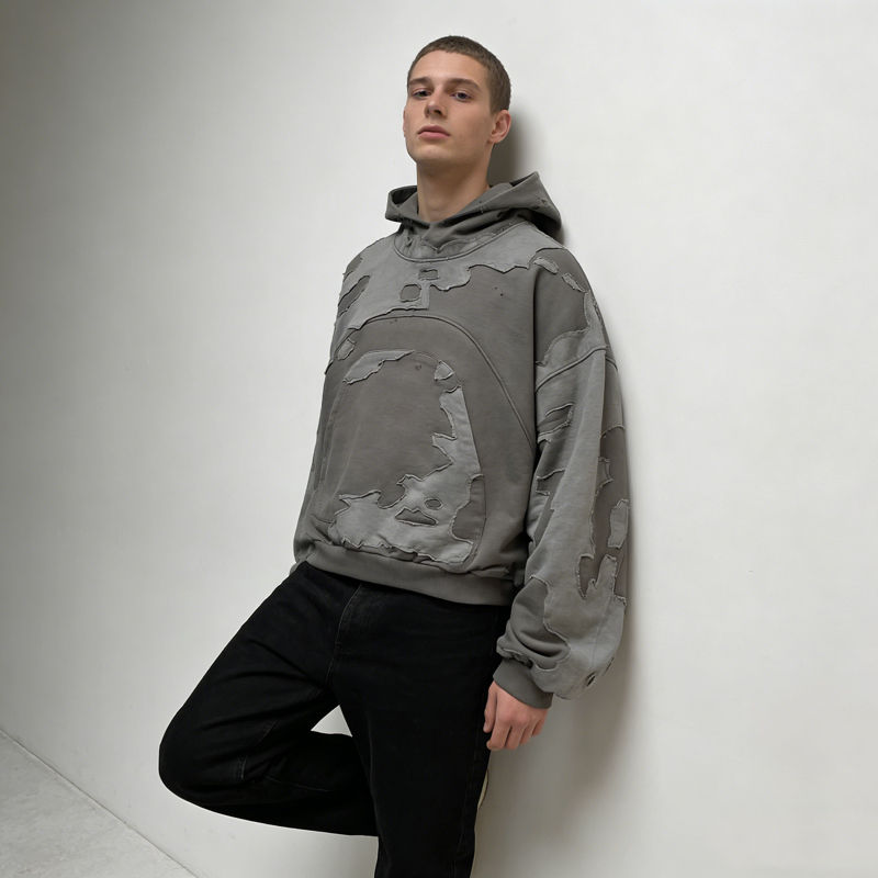 เสื้อฮู้ดดี้ผู้ชายสไตล์วินเทจสีเทาแบบมีรอยขาดแต่งผ้าปะติด ทรงโอเวอร์ไซส์ สวมใส่สบายๆ สไตล์สตรีทแวร์