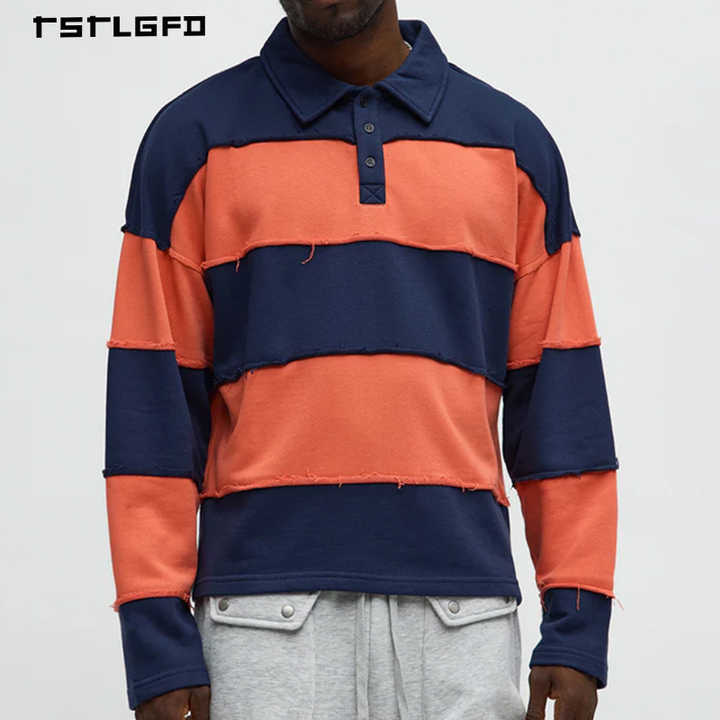เสื้อยืดผู้ชายสไตล์เรโทร ขอบดิบ แขนยาว คัลเลอร์บล็อก ไหล่ตก ทรงโอเวอร์ไซส์ หนานุ่ม สไตล์รักบี้ โปโล สตรีทแวร์
