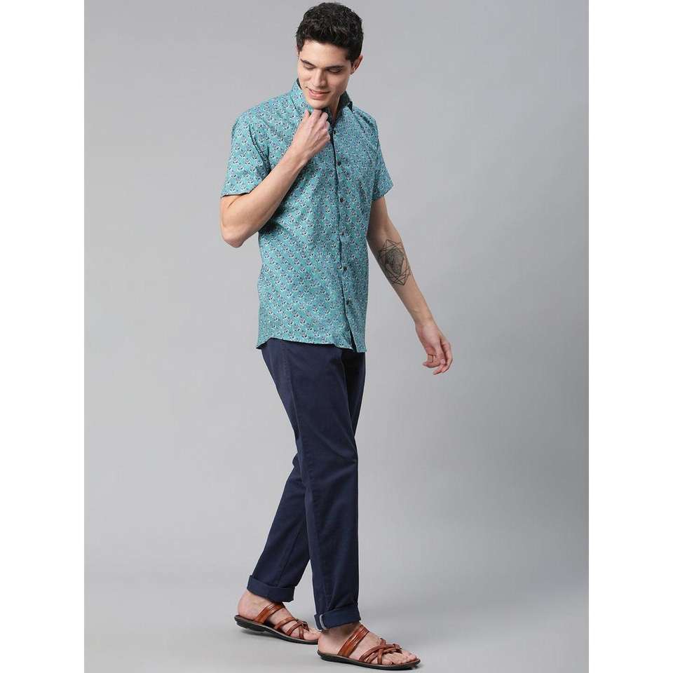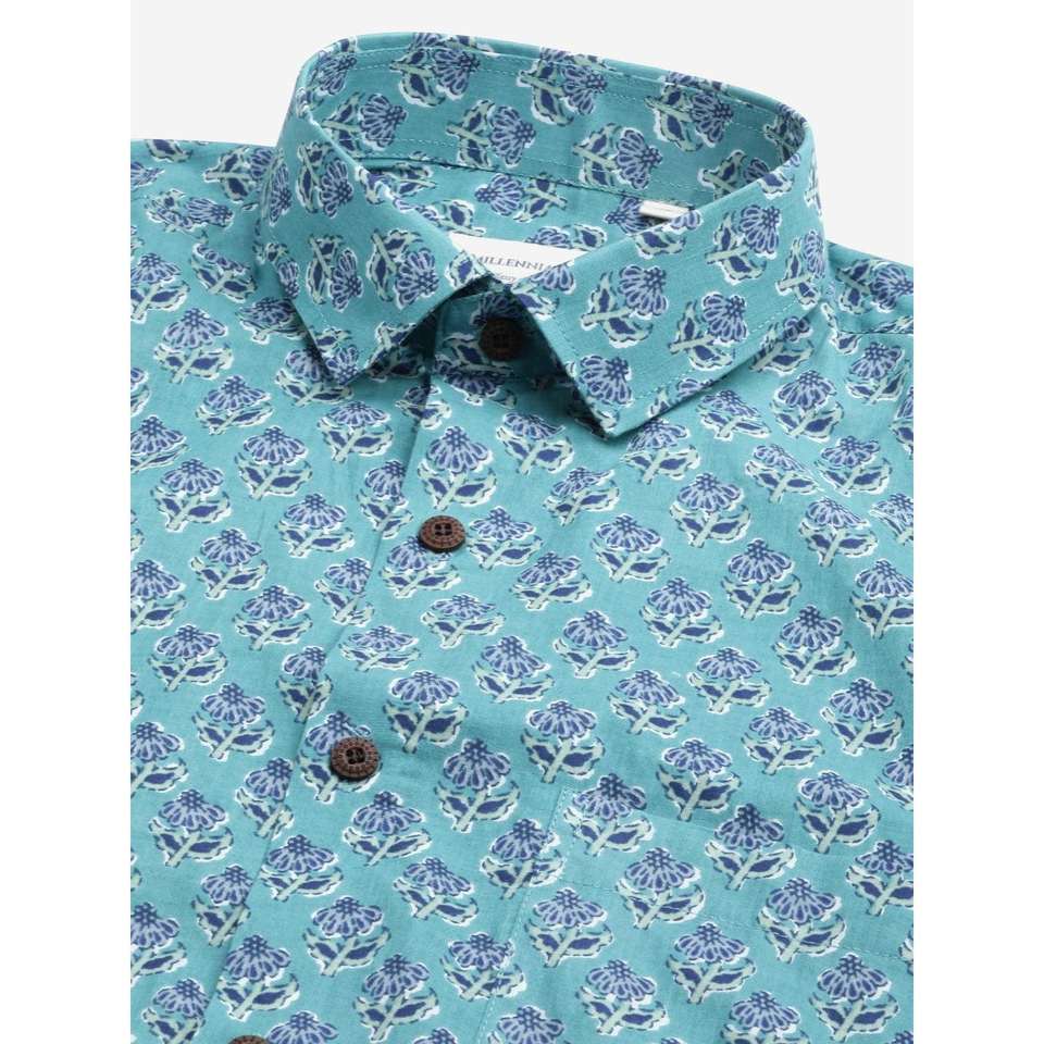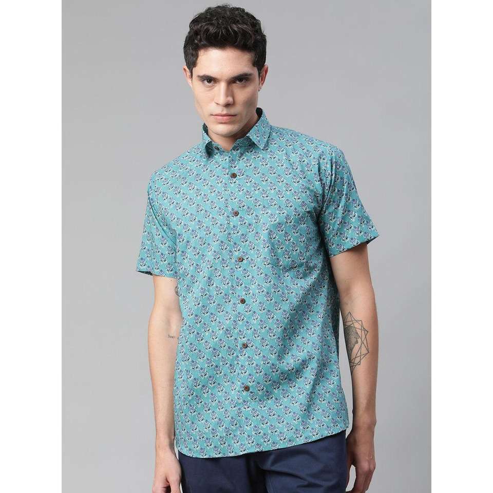 เสื้อเชิ้ตแขนสั้นผ้าคอตตอนสีฟ้าและสีฟ้าเทอร์ควอยซ์สำหรับผู้ชายเสื้อแฟชั่นลายดอกไม้ลายจุดเข้ารูปลำลองขนาด XL-MMH0179