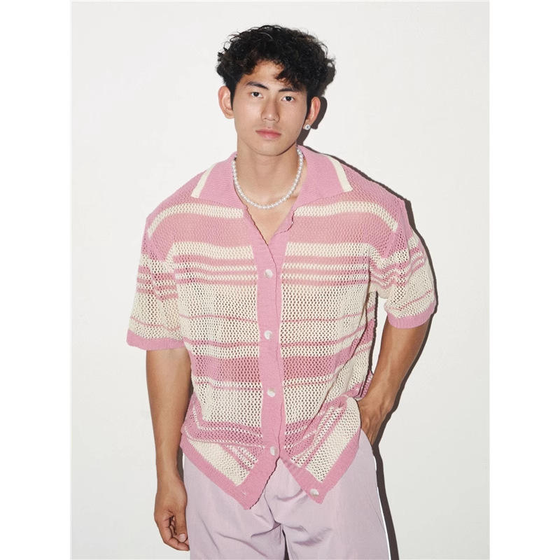 เสื้อยืดแขนสั้นลายทางถักเป็นเอกลักษณ์ของผู้ชายเสื้อยืด100% ผ้าฝ้ายกันพองสไตล์ย้อนยุคอเมริกันลำลองทรงหลวมอเนกประสงค์