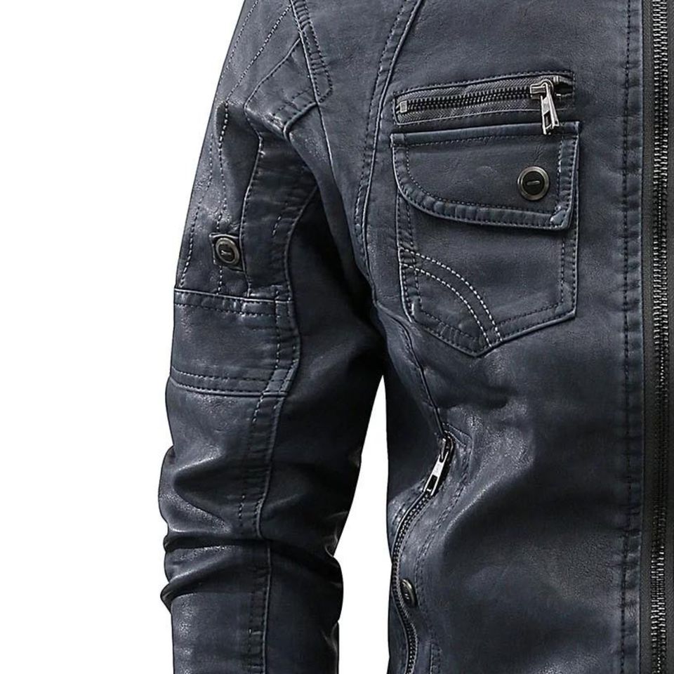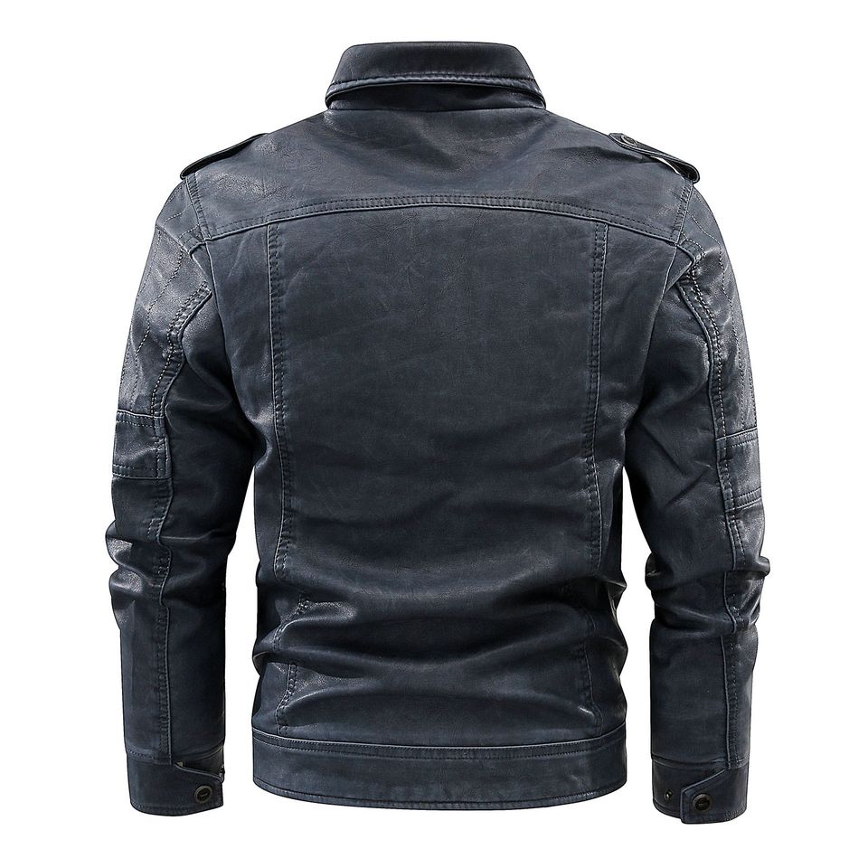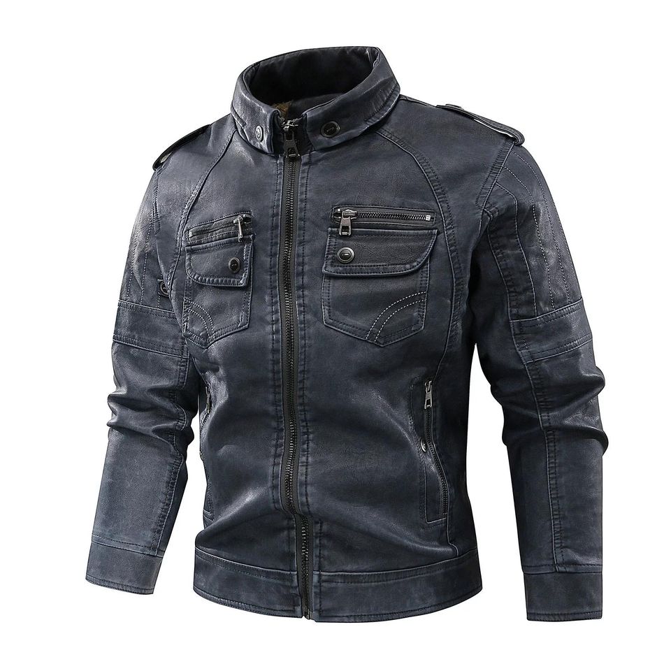แจ็กเก็ตหนังสไตล์คนเมืองสำหรับผู้ชายปกสูงมีซิปด้านหน้าหลายกระเป๋าที่ใช้งานได้หลากหลายเพื่อให้ลุคในเมืองที่ดูแข็งแรง