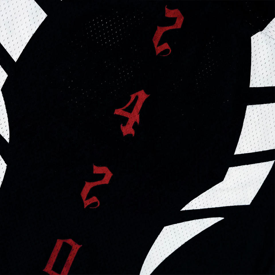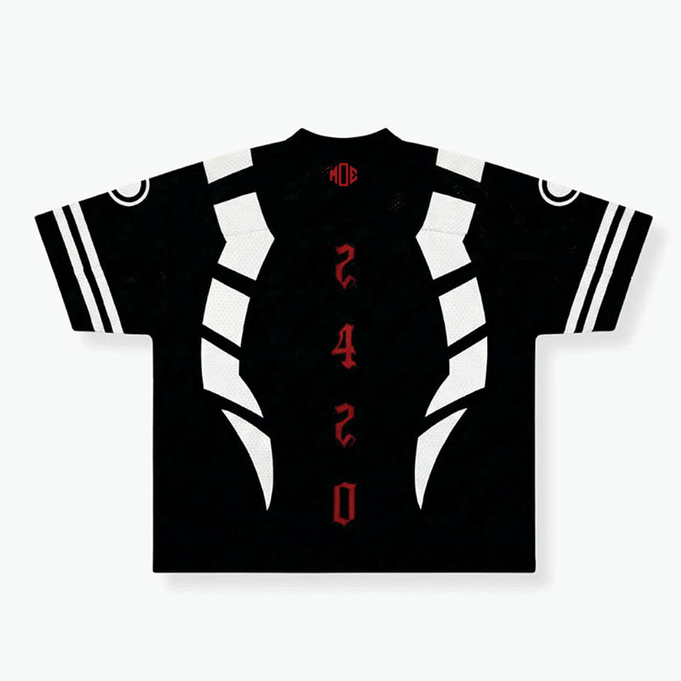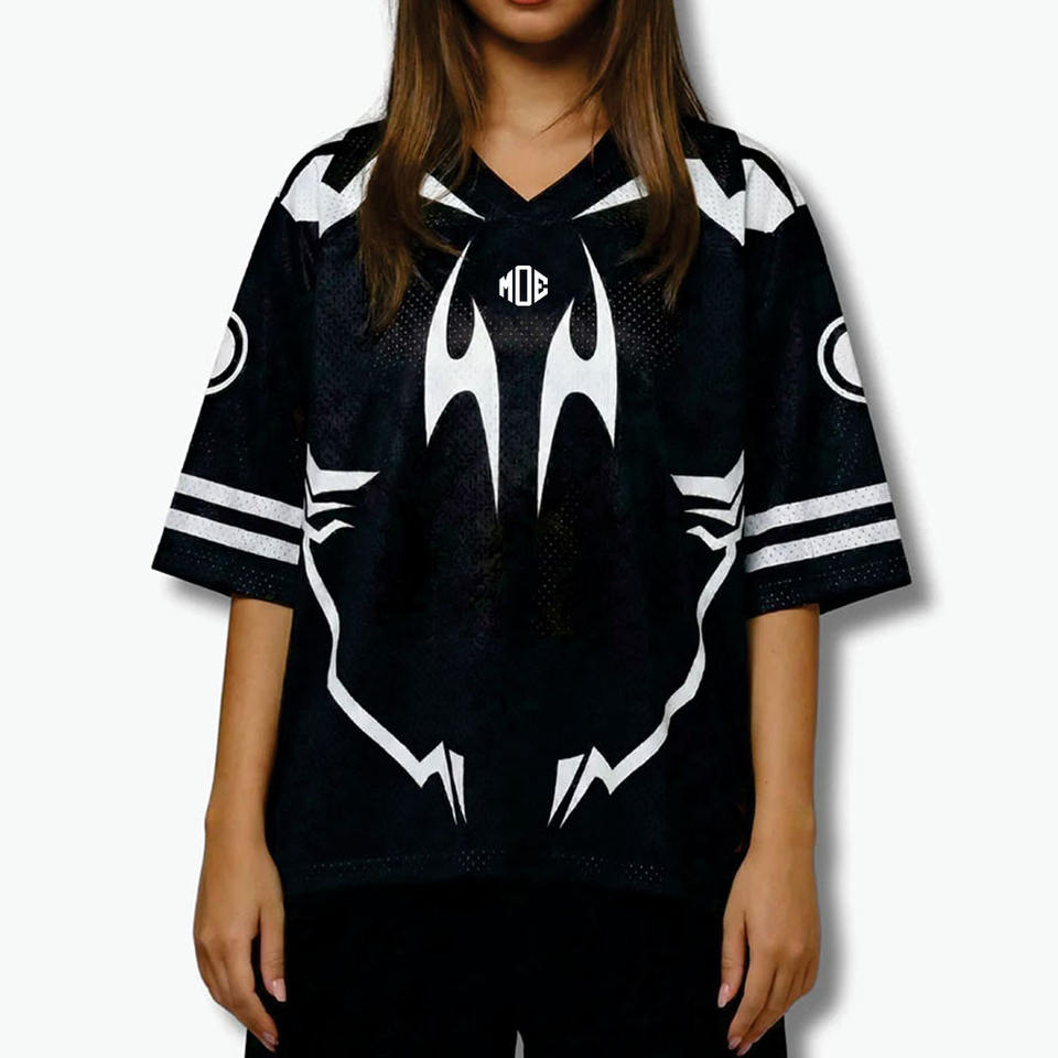 เสื้อเจอร์ซีย์อเมริกันฟุตบอลคอวีผ้าตาข่ายทรงโอเวอร์ไซส์ สไตล์สตรีท พิมพ์ลายกราฟิก เสื้อผ้ากีฬาสีดำ ระบายอากาศได้ดี ผลิตโดยโรงงาน OEM