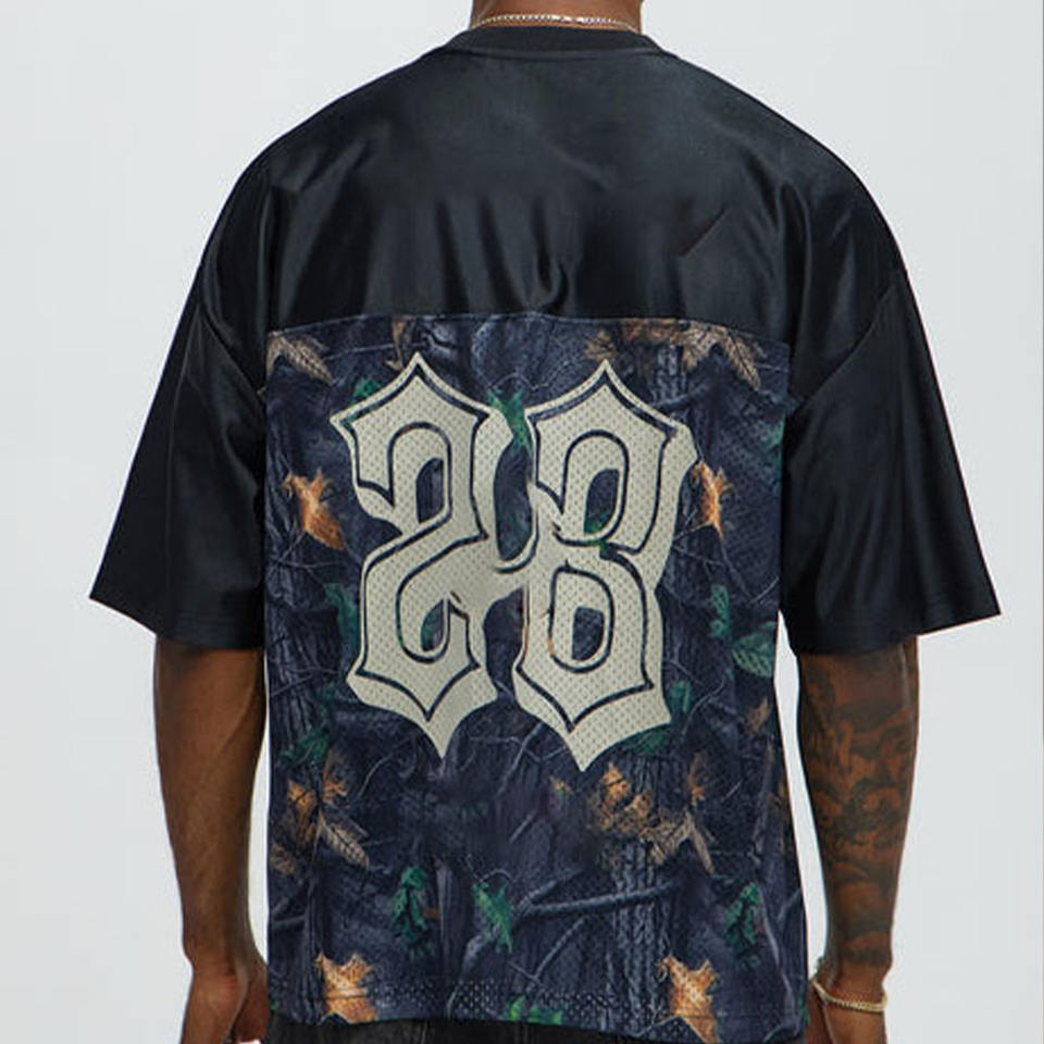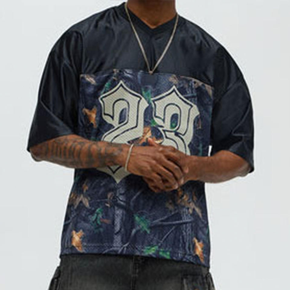 เสื้อยืดคอกว้างแขนสั้นผู้ชาย ผ้าคอตตอนหนา 220 แกรม ลายตาข่ายสไตล์ฟุตบอล พร้อมแผ่นปักหมายเลข 23 ลายกราฟิก สตรีทแวร์ OEM