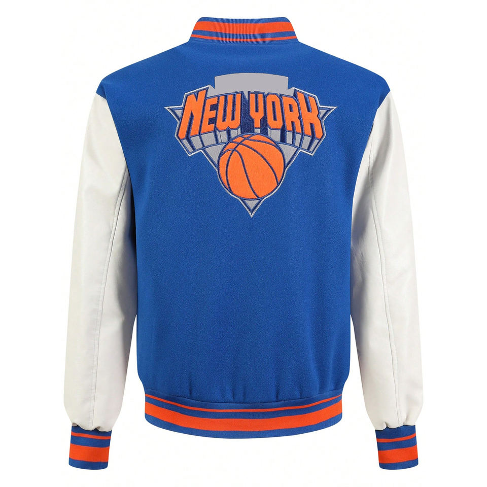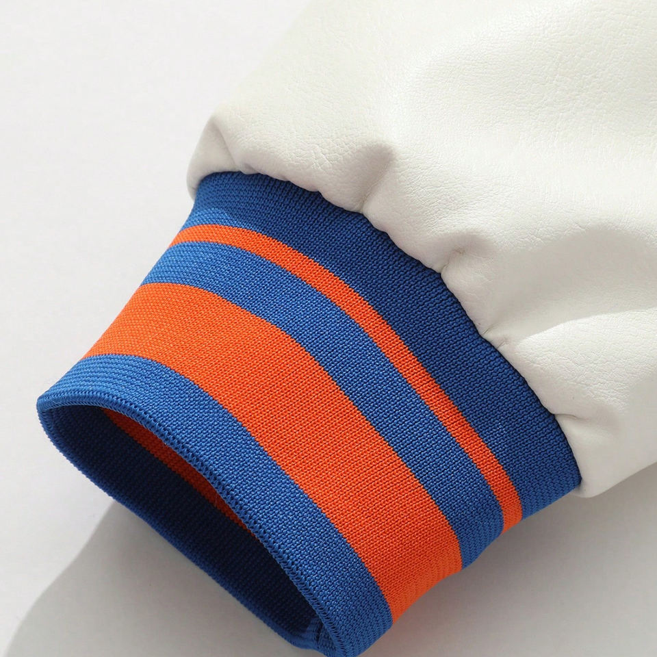 แจ็คเก็ตเบสบอลทรงบอมเบอร์สำหรับผู้ชาย คอตั้ง ปักโลโก้ด้านหน้า ผ้าผสมขนสัตว์ แขนหนัง PU แต่งขอบถัก ระบายอากาศ กันลม