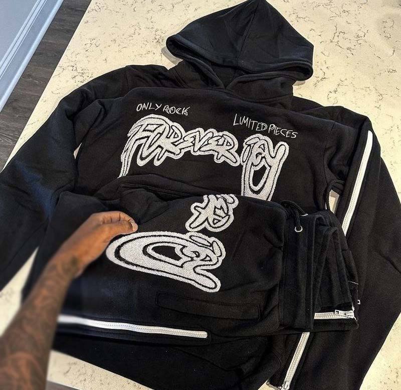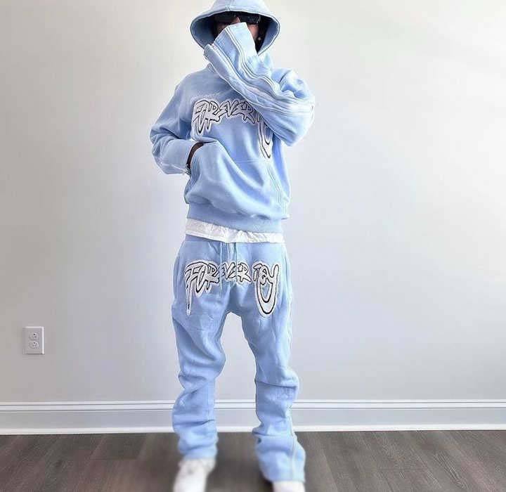 ชุดวอร์มผ้าฝ้าย2ชิ้นแบบวินเทจของผู้ชายชุดวอร์มสีน้ำเงินพิมพ์ลายปกติผ้ากำมะหยี่ปัก100% ผ้าคอตตอน