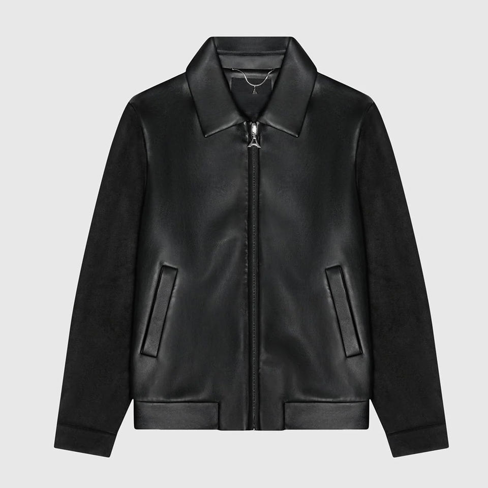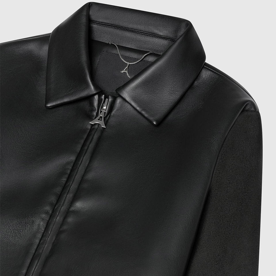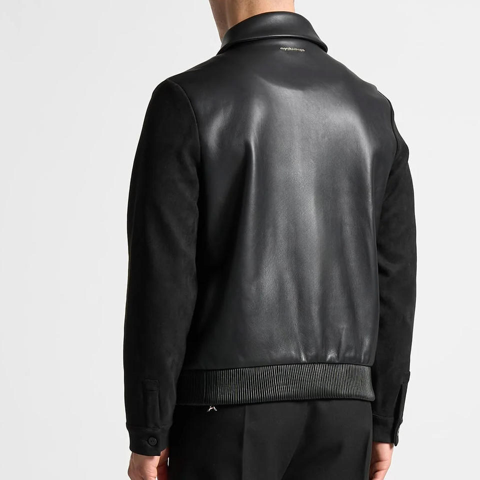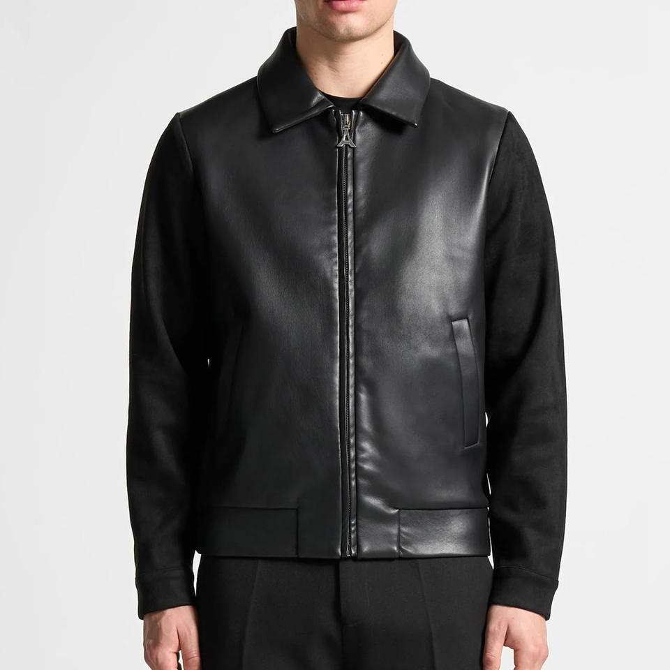 แจ็กเก็ตสีดำแนววินเทจของผู้ชายมีปกตั้งแขนหนังขนสัตว์หนาเย็บปักสำหรับเลตเทอร์แมนเด็กผู้ชายขายส่ง
