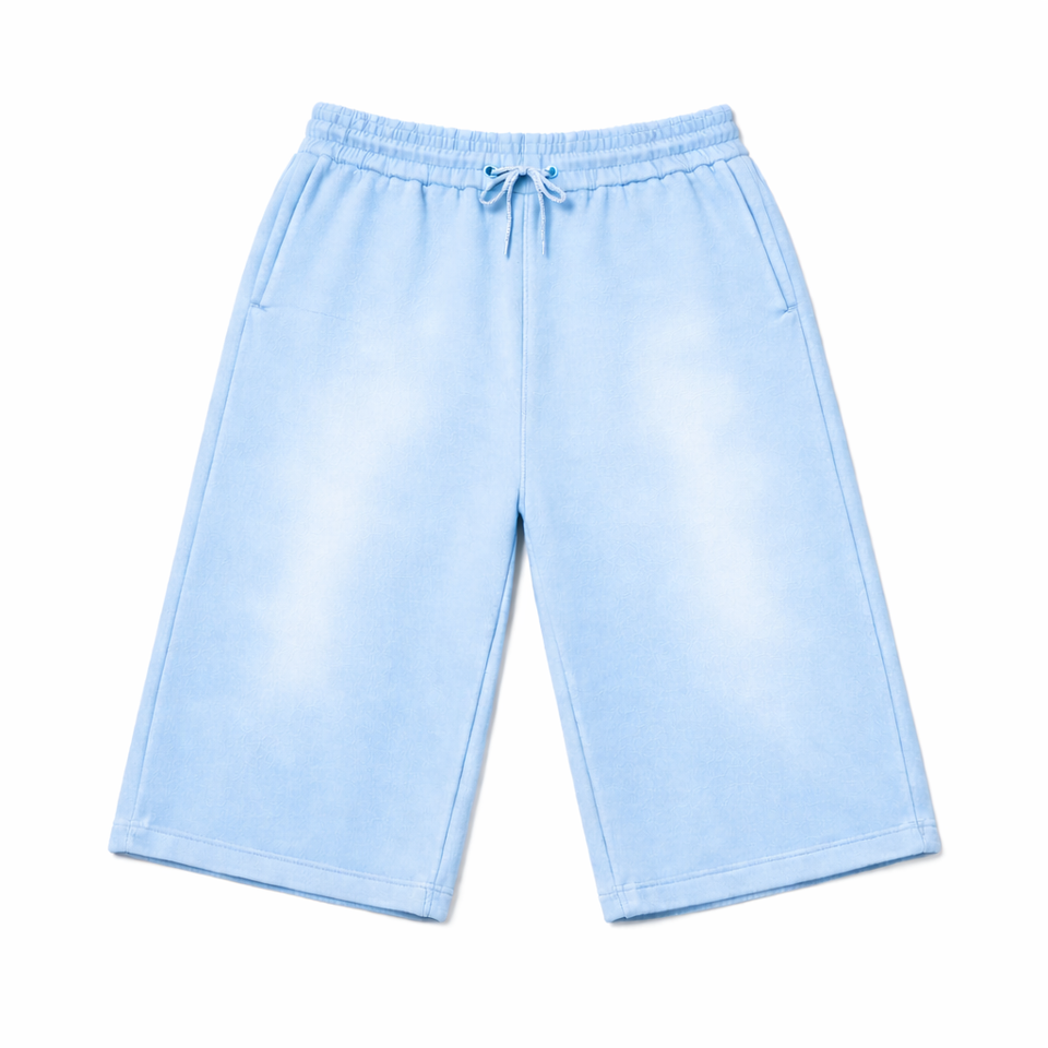 กางเกงขาสั้นผู้ชายสไตล์วินเทจผ้าเฟรนช์เทอร์รี่ฟอกสีแบบแอซิดวอช กางเกงขาสั้นฤดูร้อนผ้าฝ้ายหนาสีซีดแบบซันเฟด มีเชือกผูกเอว ปักลายพิมพ์