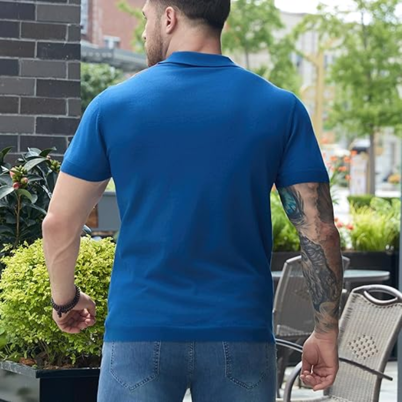 เสื้อโปโลถักสไตล์วินเทจสำหรับผู้ชาย – เสื้อเชิ้ตแขนสั้นสไตล์เรโทรยุค 70 ติดกระดุมพร้อมลายทางแนวตั้งแบบลำลอง