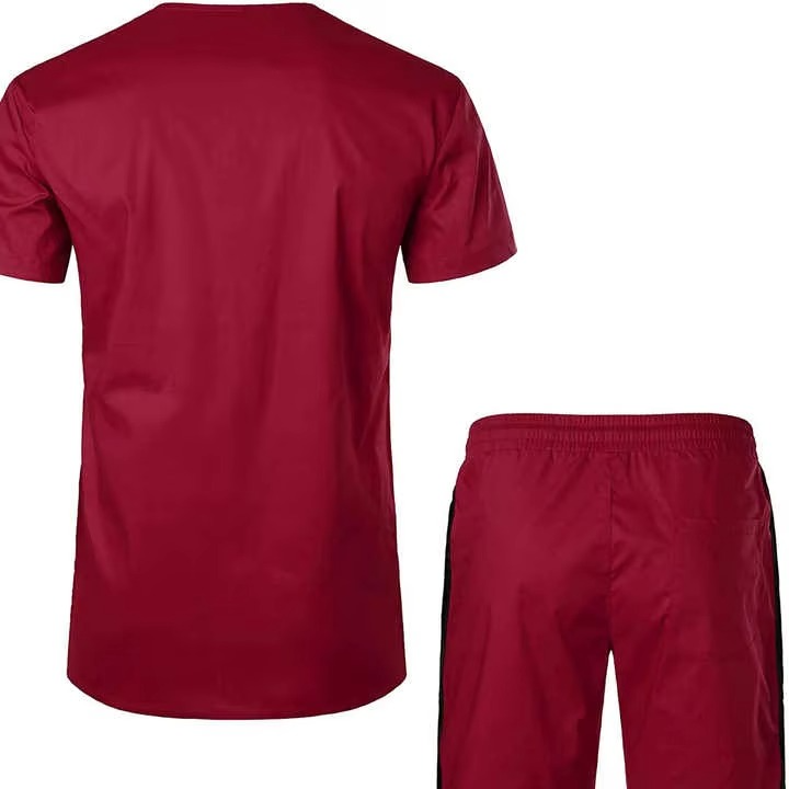 ชุดเสื้อยืดและกางเกงขาสั้นผ้าฝ้ายถักสไตล์วินเทจสำหรับผู้ชาย ชุดสองชิ้นสำหรับฤดูร้อน พร้อมโลโก้แบบกำหนดเอง
