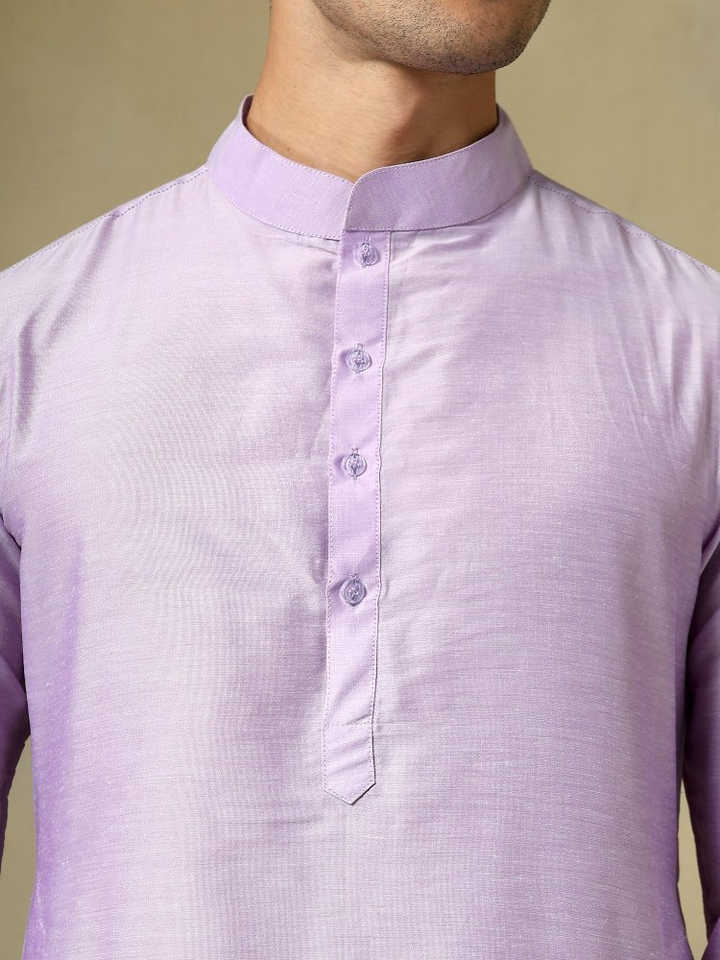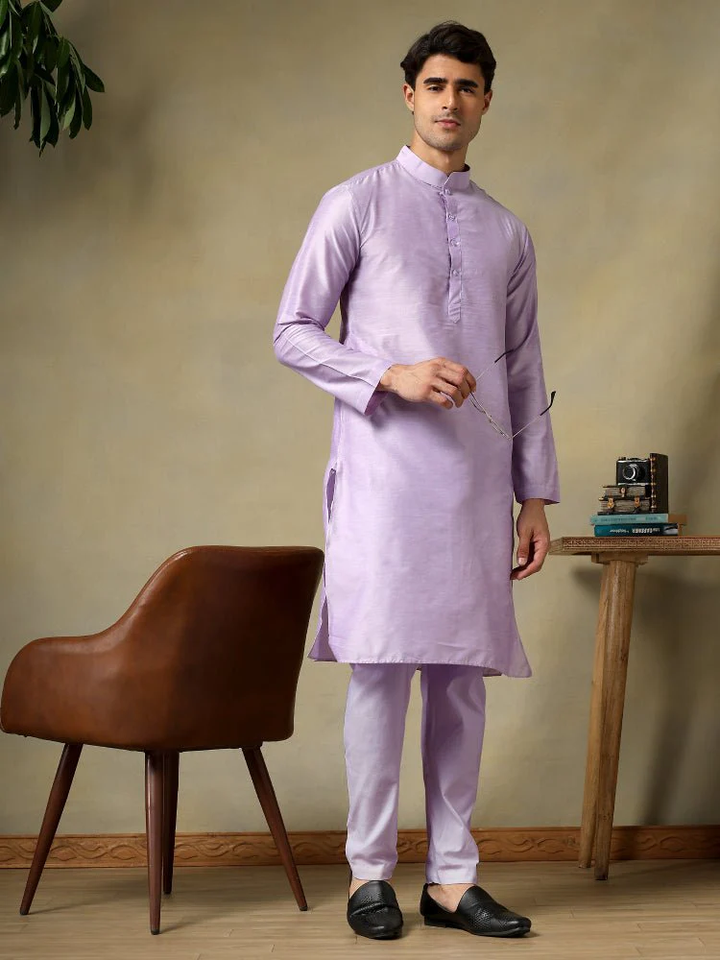 ชุดคุर्ตาผ้าไหมผสมฝ้ายสีม่วงไลแลคสไตล์วินเทจสำหรับผู้ชาย เหมาะสำหรับงานปาร์ตี้ งานแต่งงาน งานดีวาลี ชุดลำลองชายหาด คอจีน แขนยาว