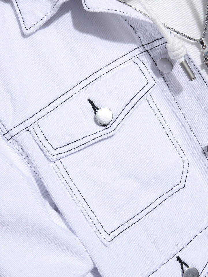 แจ็คเก็ตยีนส์ผู้ชายสไตล์วินเทจทรงโอเวอร์ไซส์สีขาวฟอกแบบแอซิด คอตั้ง ทรงหลวม มีกระเป๋าใหญ่สี่ช่อง แขนยาว สวมใส่สบายๆ สำหรับฤดูใบไม้ผลิ