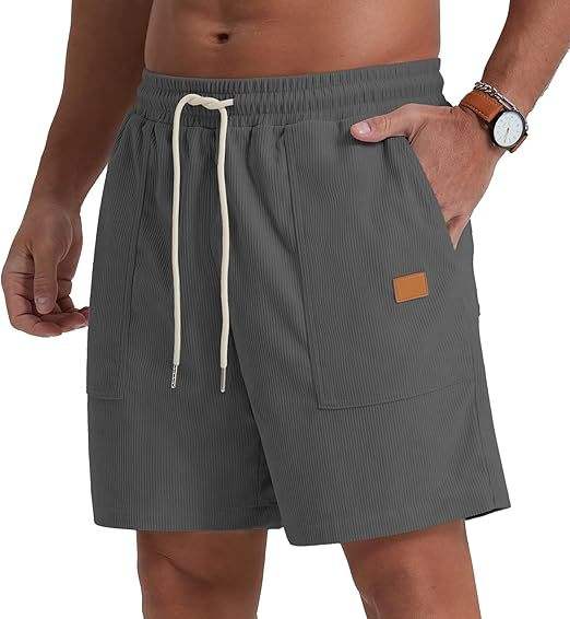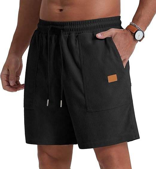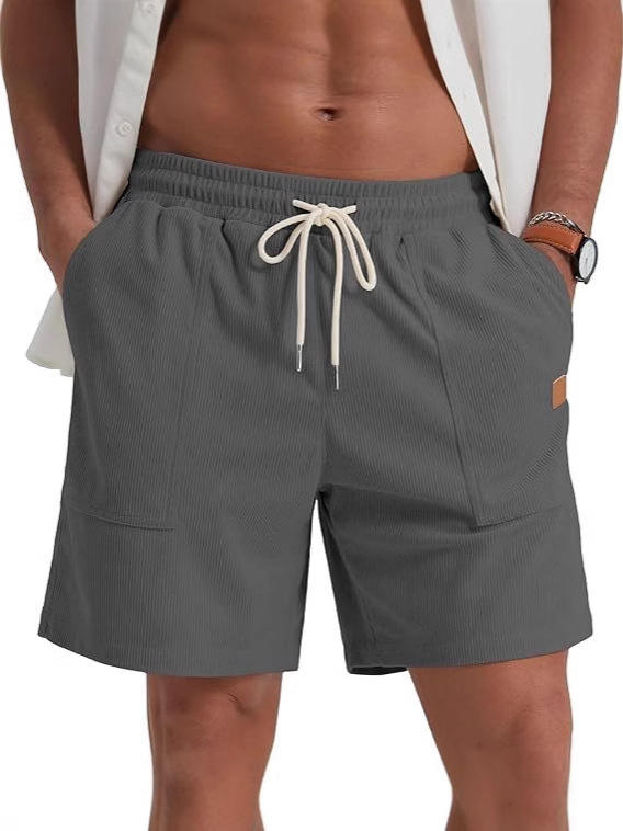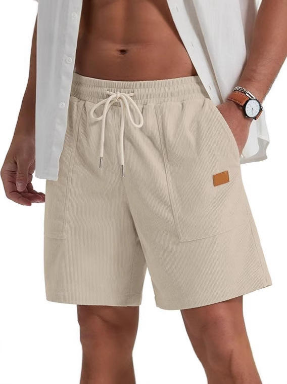 กางเกงขาสั้นผ้าลูกฟูกเอวยางยืดสไตล์วินเทจของผู้ชายกางเกงขาสั้นผ้า100% เบอร์มิวดายาวถึงเข่าใส่สบายโลโก้ถนนสูง