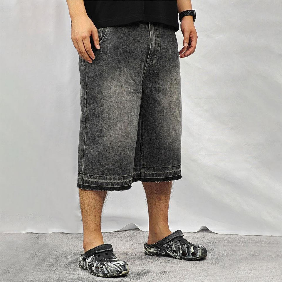 กางเกงยีนส์ขาสั้นสีดำฟอกทรงหลวมสไตล์ลำลองสำหรับผู้ชาย ขายส่ง/OEM