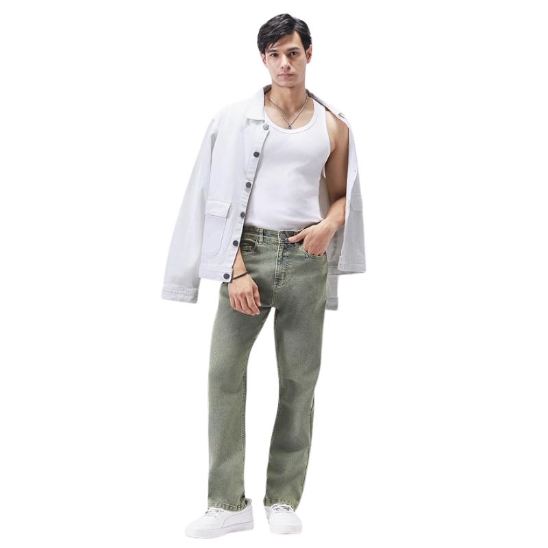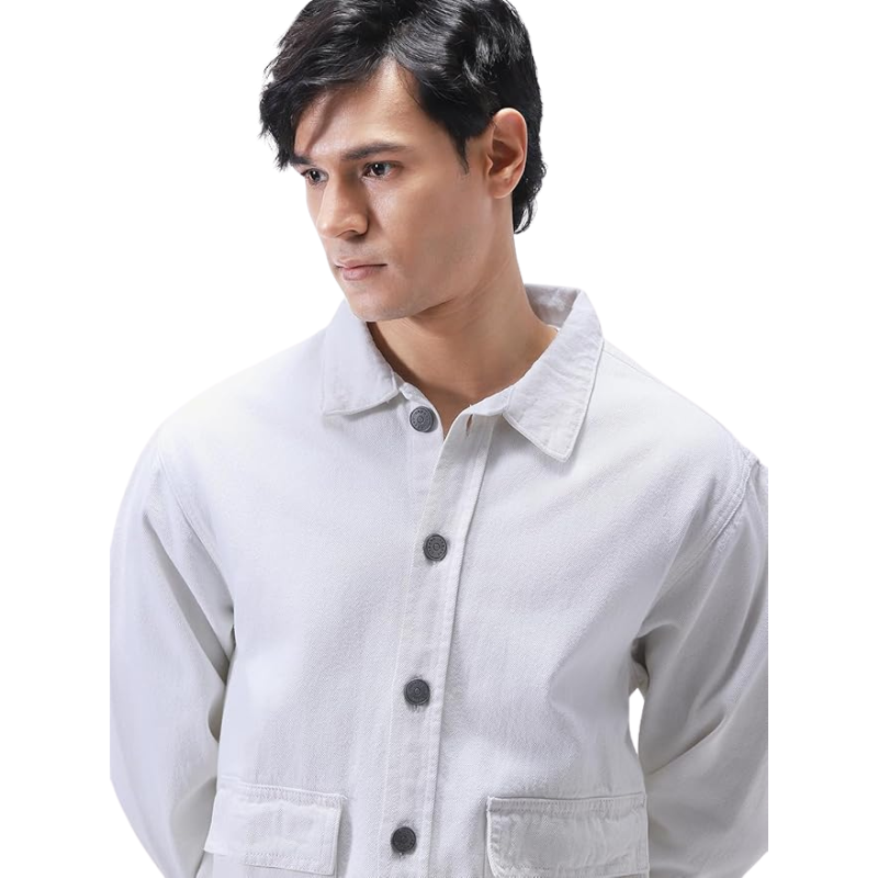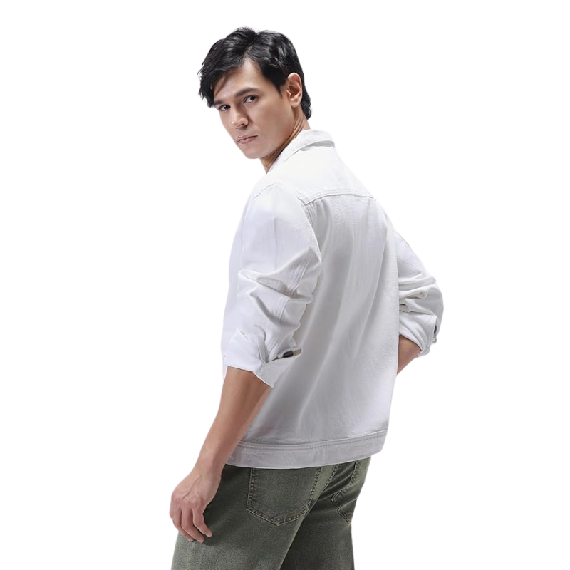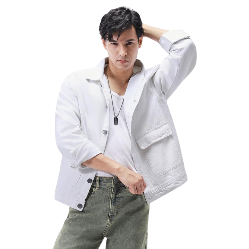 แจ็กเก็ตยีนส์สีขาวของผู้ชายเสื้อแจ็กเก็ตยีนส์ผ้าฝ้ายแบบลำลองแนวสตรีท