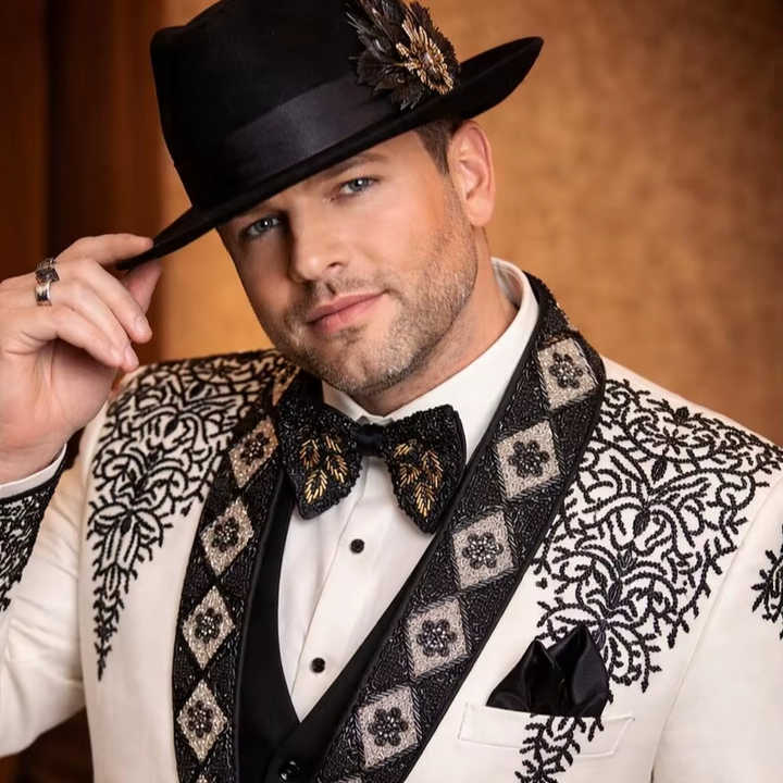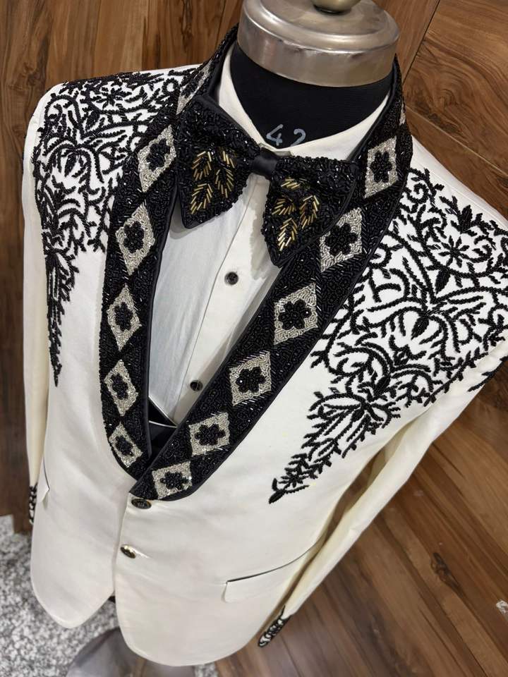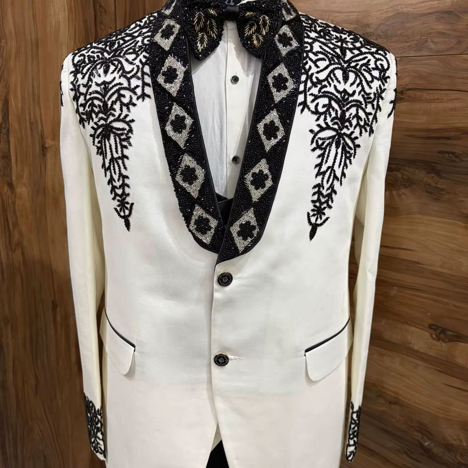ชุดทักซิโด้ปักลายดีไซเนอร์สีขาวสำหรับผู้ชายพร้อมปกผ้าคลุมไหล่ประดับลูกปัดสีดำ – ชุดสูท 3 ชิ้นสำหรับงานแต่งงานเจ้าบ่าว