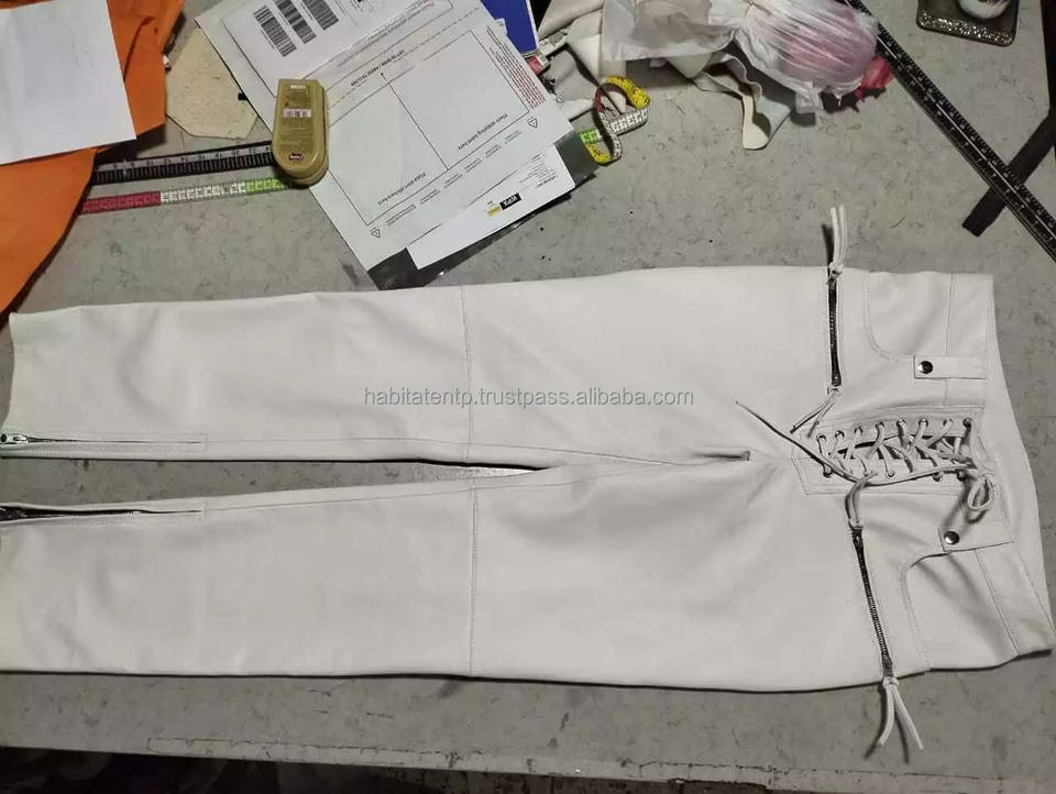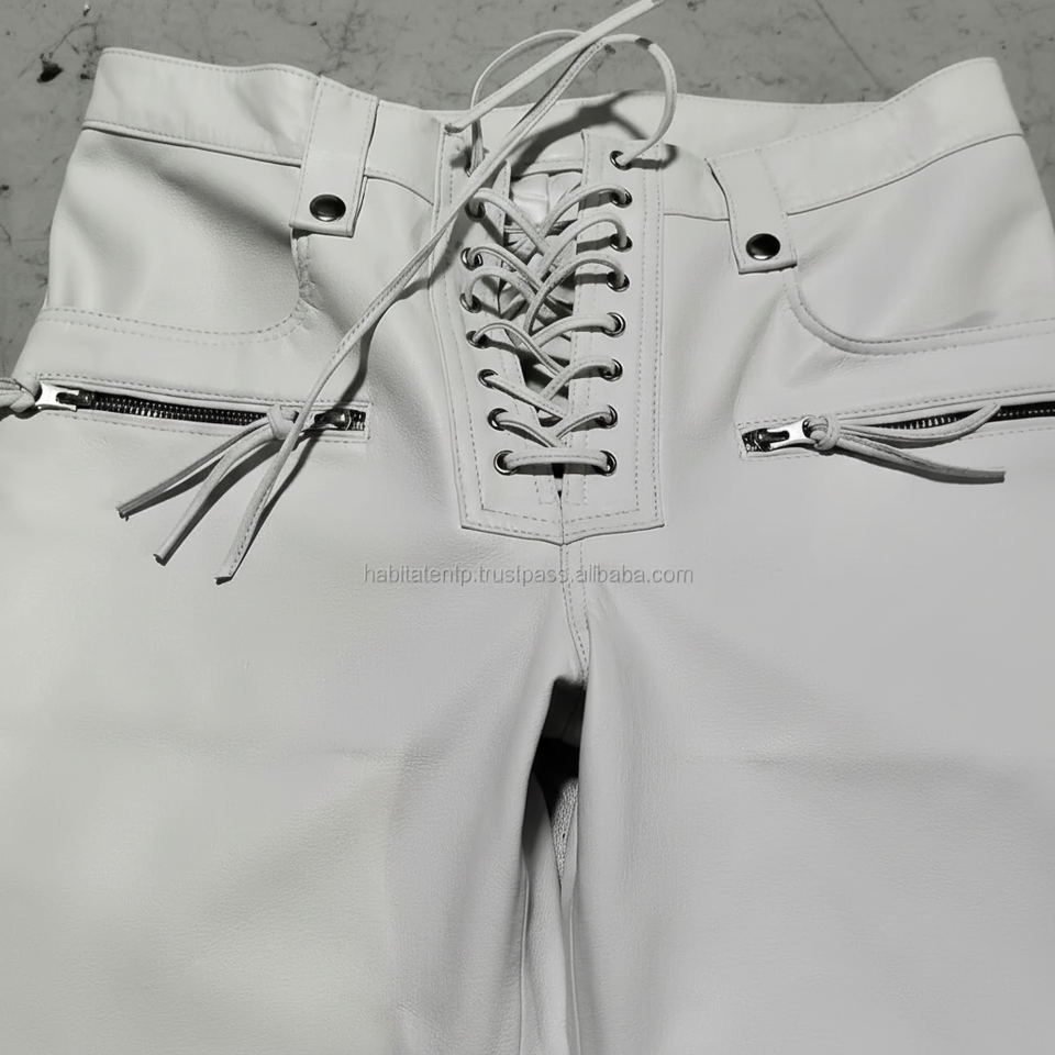 Men's White Motorcycle Leather Pant Real Soft Lambskin Lace up Biker OEM ODM Designer Pants Trousers Soft Feel