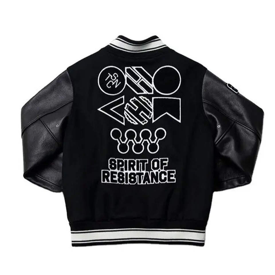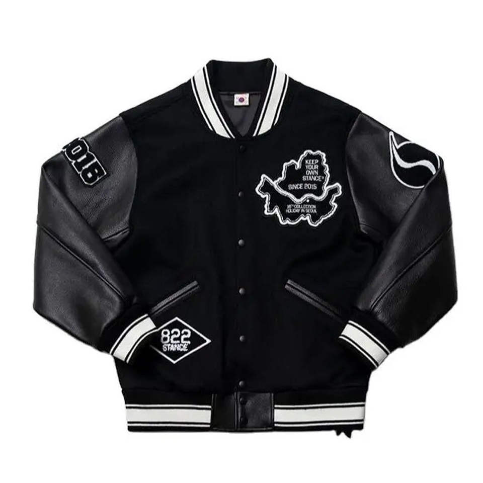 แจ็คเก็ตวาร์ซิตี้ผู้ชายขายส่ง แบบสั่งทำพิเศษ ตัวเสื้อทำจากผ้าขนสัตว์หนา แขนหนัง คอตั้ง ปักลายด้านหน้า ทรงหลวม