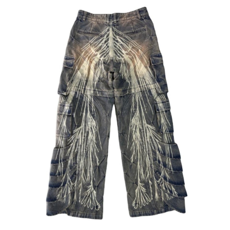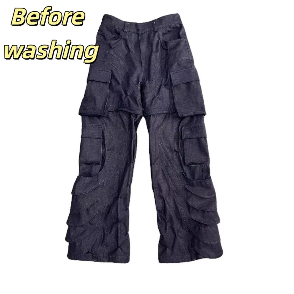 กางเกงยีนส์คาร์โก้ทรงขากว้างสำหรับผู้ชาย พร้อมจีบสไตล์ ARMADILLO และลายเลเซอร์ - กางเกงยีนส์เนื้อหนาแบบซับซ้อน ล้างสีแบบมuddy wash
