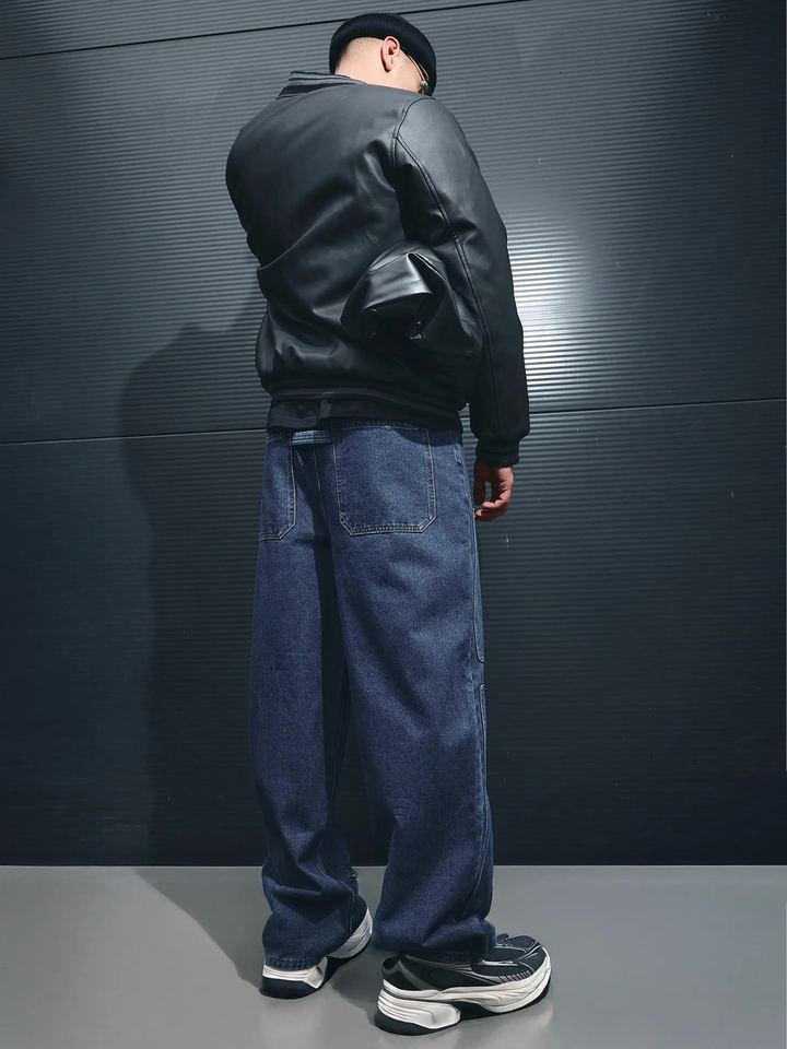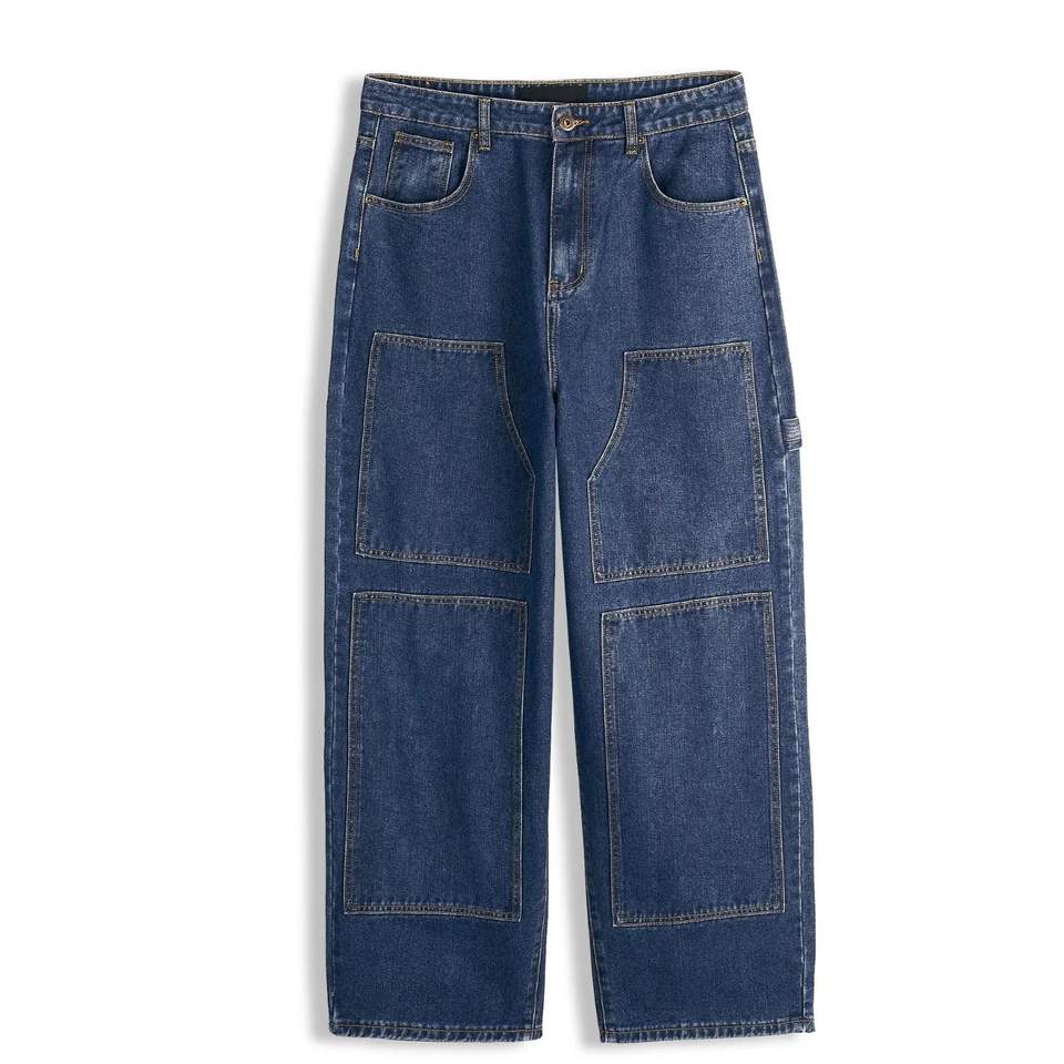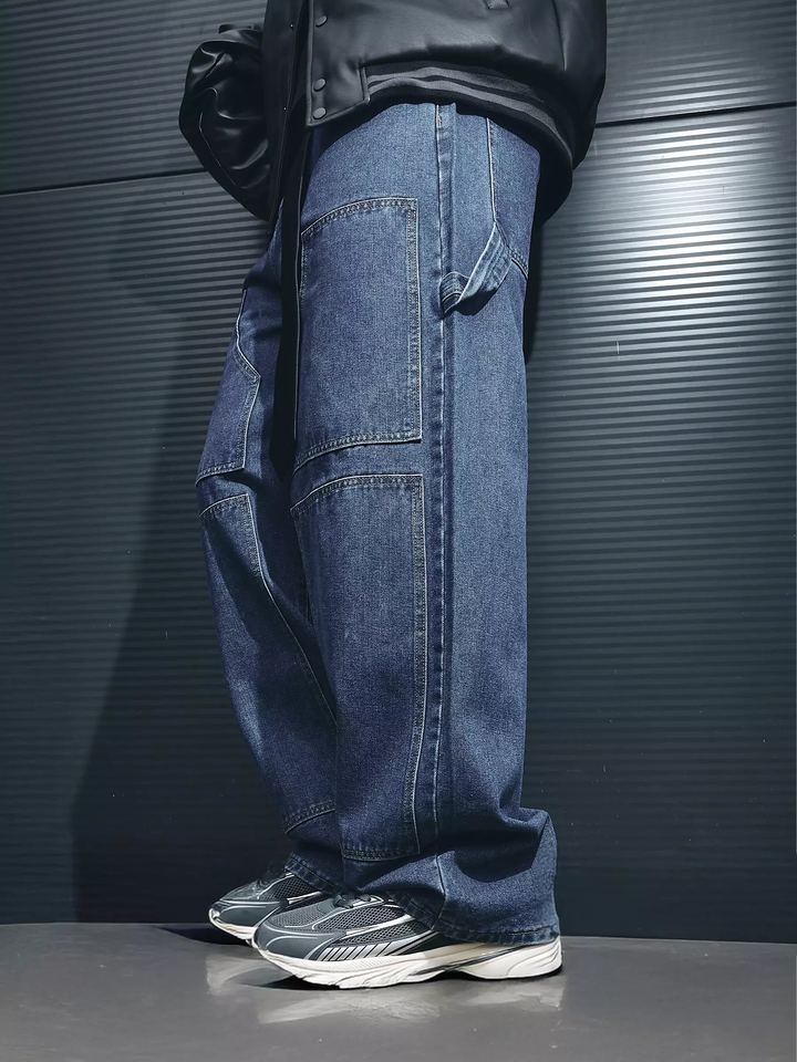 กางเกงยีนส์เดนิมทรงขากว้างสำหรับผู้ชายพร้อมกระเป๋าปะแบบอเนกประสงค์ – กางเกงยีนส์สีน้ำเงินทรงหลวมสไตล์สตรีทแวร์ลำลองสั่งทำขายส่ง