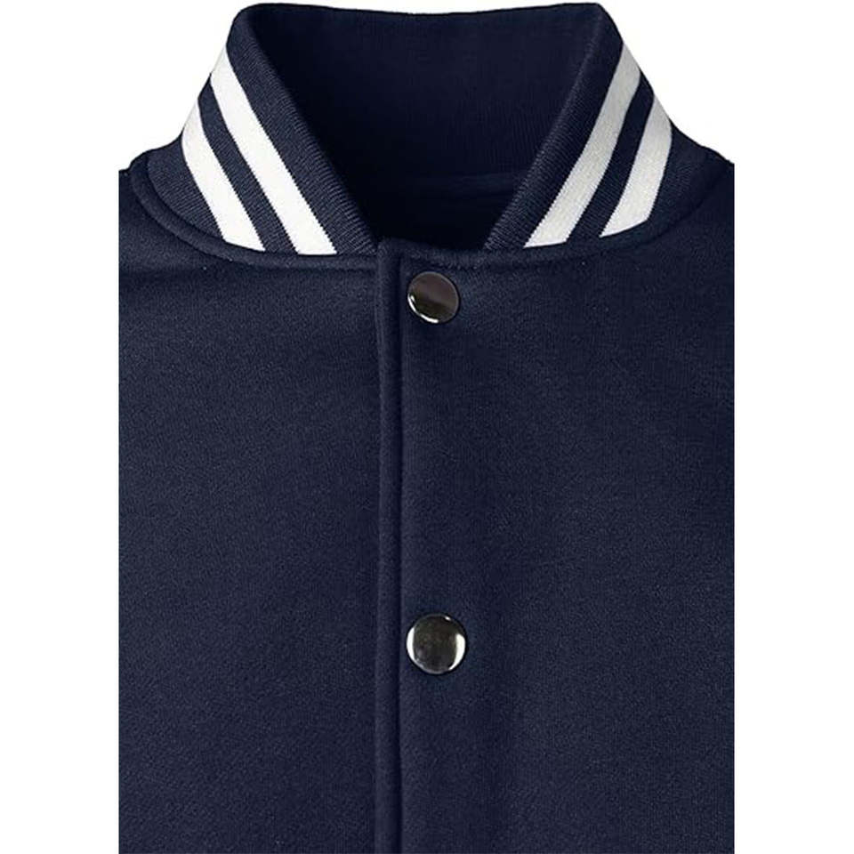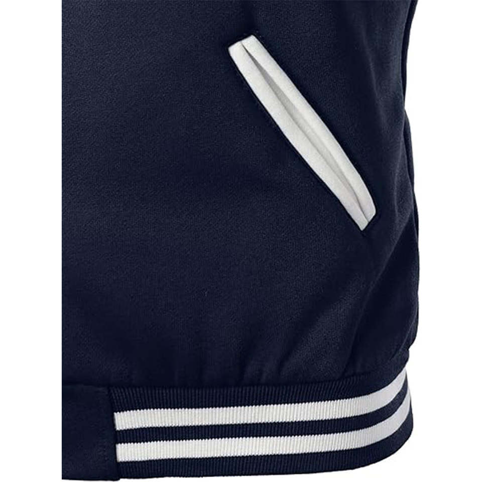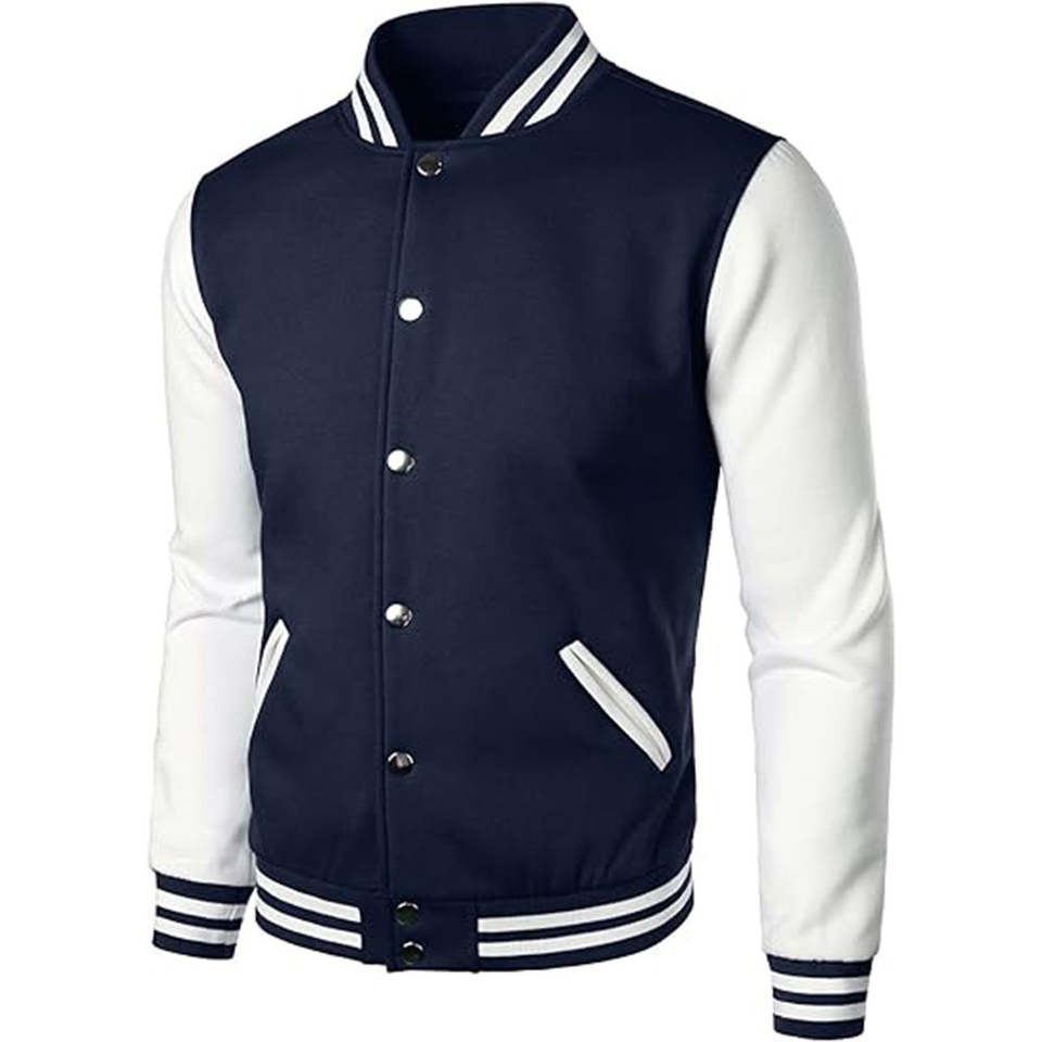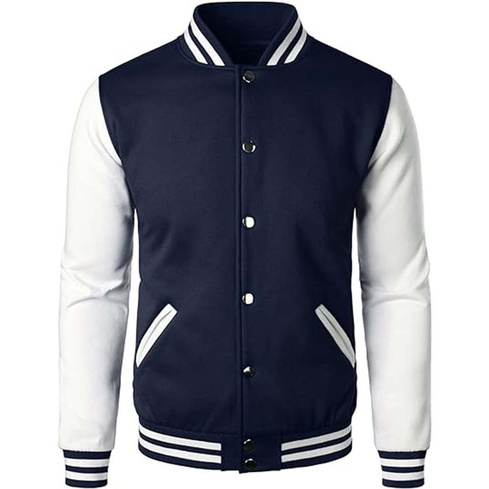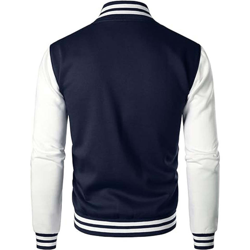 เสื้อแจ็คเก็ตเบสบอลผู้ชายสำหรับฤดูหนาว แบบต่อผ้าด้านหน้า สไตล์สตรีทลำลอง ปักลายแบบวาร์ซิตี้ ย้อมสีพื้นและเคลือบผิว