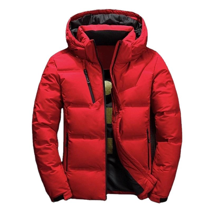 เสื้อโค้ทขนเป็ดมีฮู้ดสำหรับผู้ชายเสื้อโค้ทขนเป็ดแบบหนาคอปกตั้งเสื้อโค้ทยาวเสื้อกันหนาวขนเป็ดใส่สบายลวดลายพื้น