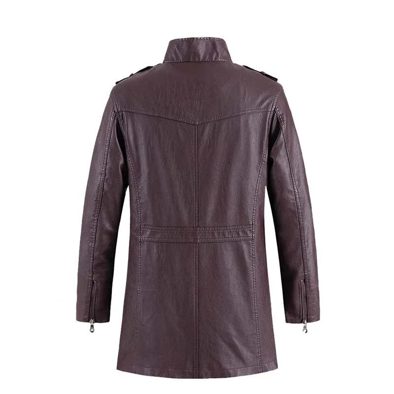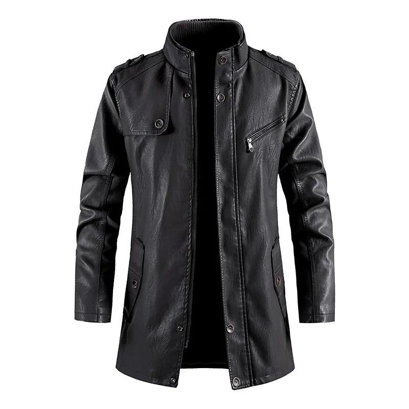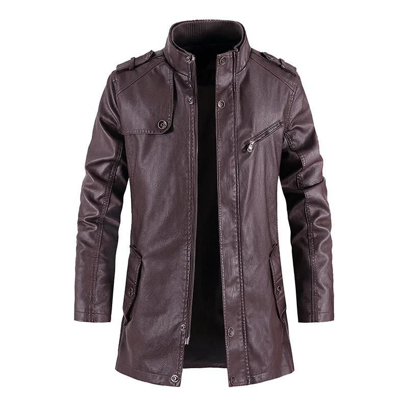 เสื้อแจ็กเก็ตมอเตอร์ไซค์สำหรับผู้ชาย, ใหม่สีทึบคอตั้งหนัง PU พร้อมกระดุมผ้ากำมะหยี่เสื้อโค้ทยาวปานกลางมีซิป