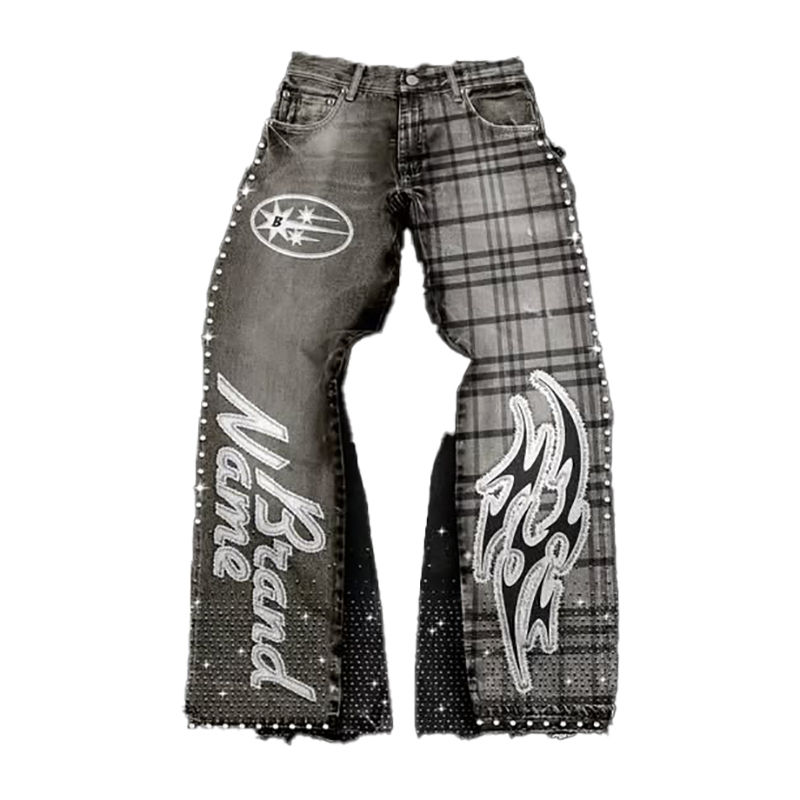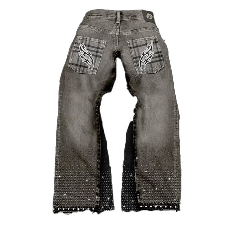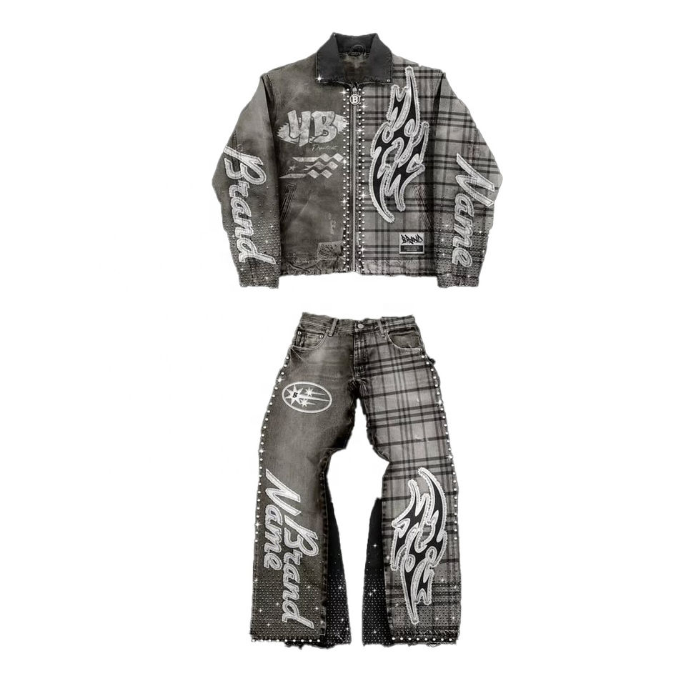 ชุดยีนส์เดนิมหนาสำหรับผู้ชาย สไตล์วินเทจ ซันเฟด แต่งลายปักและลายพิมพ์ประดับเพชร