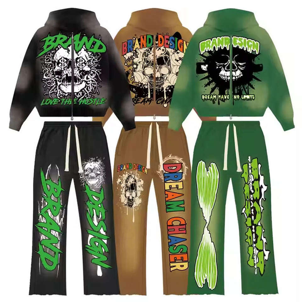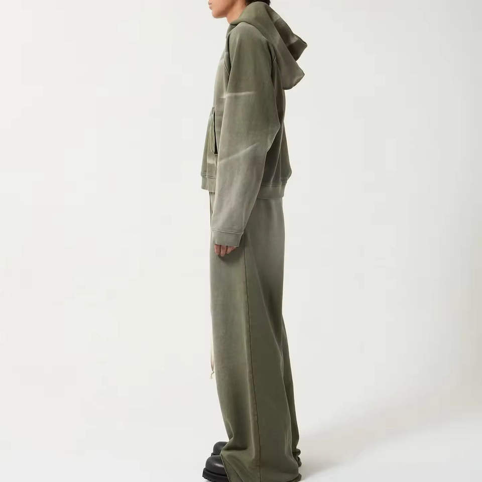 ชุดเสื้อผ้าฤดูหนาวสำหรับผู้ชาย ชุดเซ็ตสีพื้นแบบกำหนดเอง ผ้าฟลีซบุซับใน ซิปหน้า เสื้อฮู้ดดี้และกางเกงจ็อกเกอร์ ทรงปกติ มีกระเป๋าข้าง กันลม
