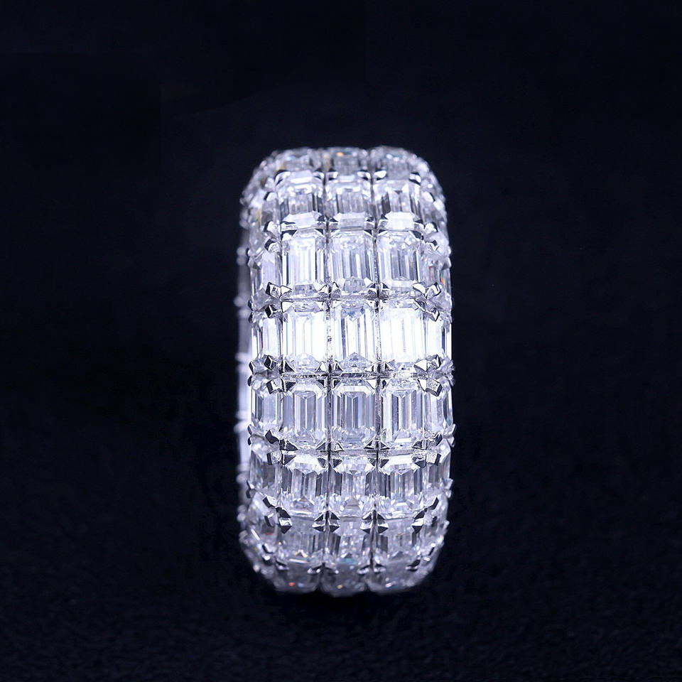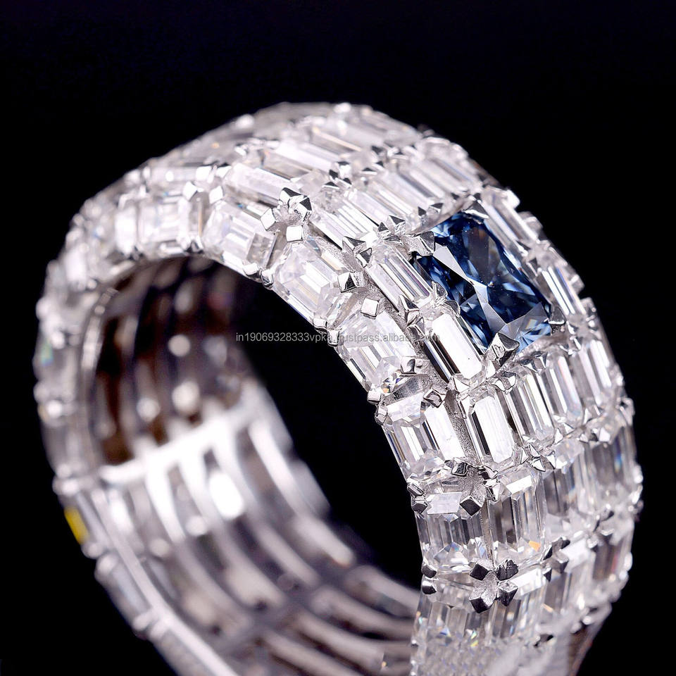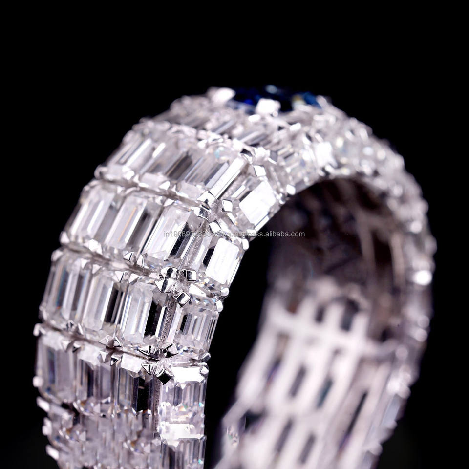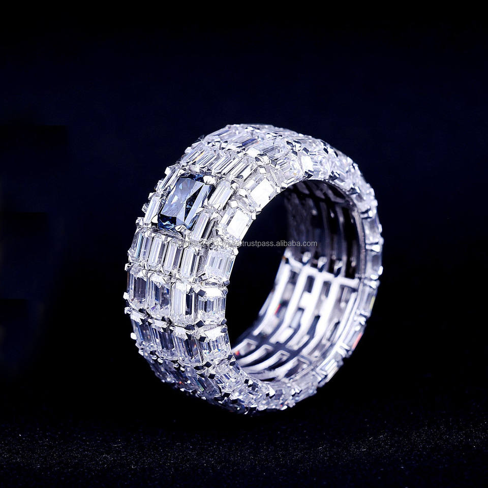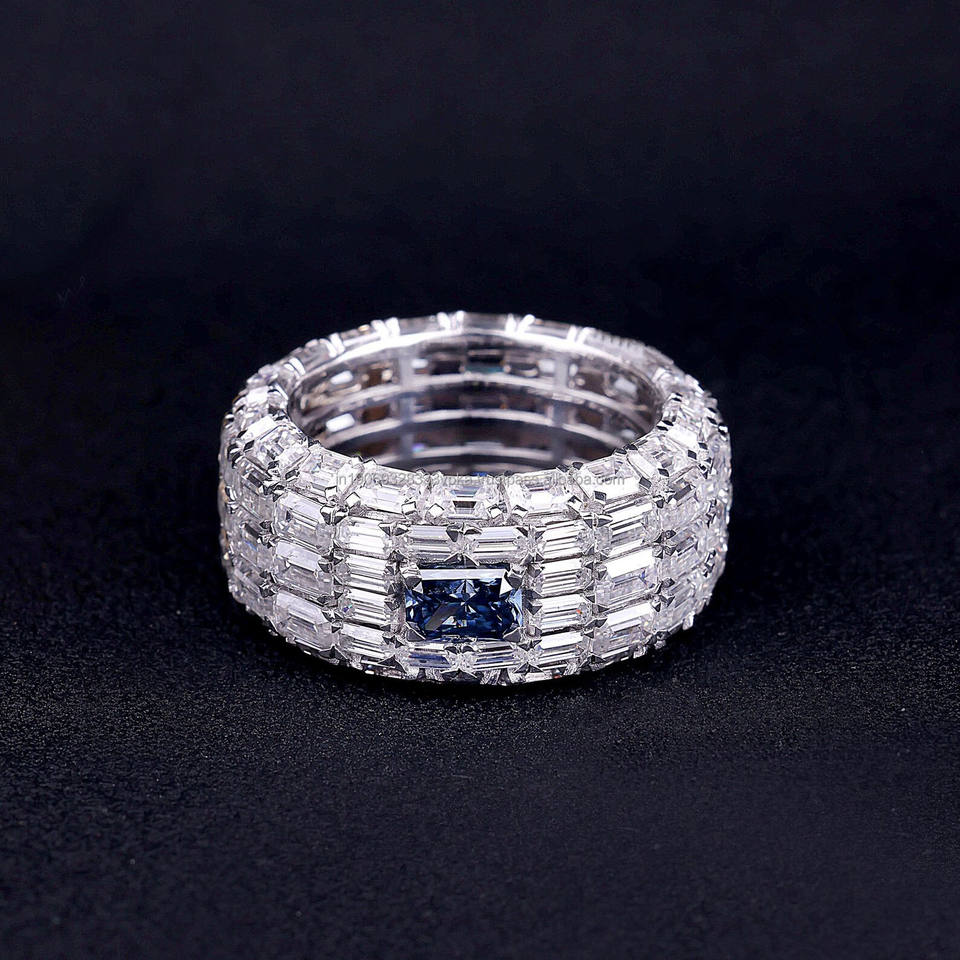 แหวนแต่งงานผู้ชายผู้หญิงทรงเรขาคณิตประดับมรกตสีน้ำเงินและไพลินเจียระไนแบบเรเดียนท์ ชุบโรเดียม เงินแท้ สไตล์ฮิปฮอป