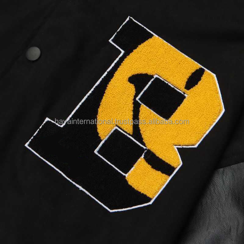 แจ็กเก็ตขนสัตว์มีปกคอตั้งสำหรับผู้ชายเลตเทอร์แมนปักลายด้วยผ้ากำมะหยี่ยิ้มแขนเสื้อหนังแท้สำหรับฤดูหนาว