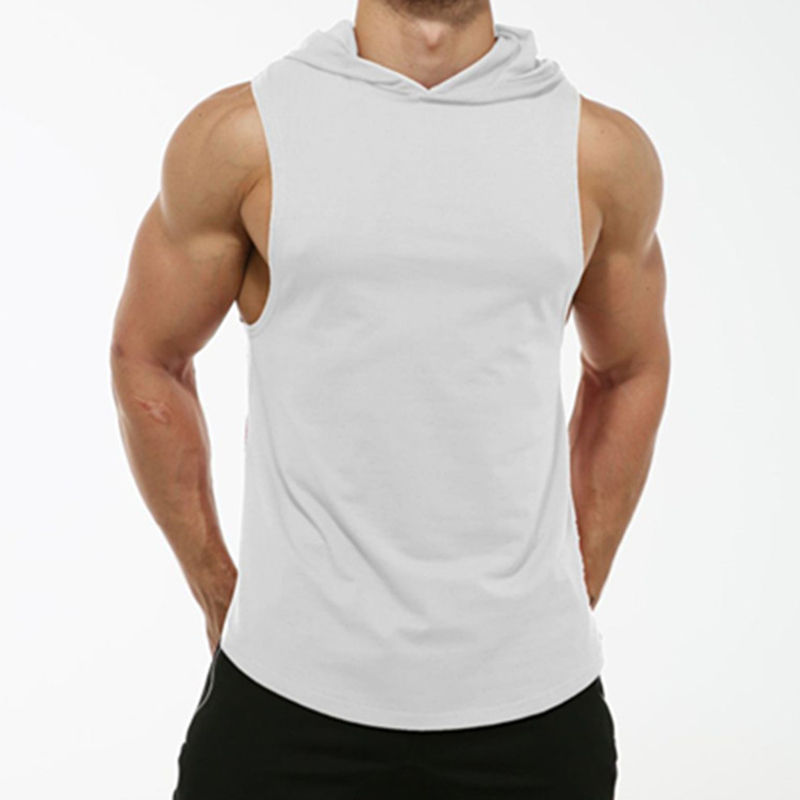 เสื้อกล้ามมีฮู้ดสำหรับออกกำลังกายผู้ชาย เสื้อฮู้ดแบบสวมหัว ระบายอากาศได้ดี แห้งเร็ว ผลิตจากโพลีเอสเตอร์/คอตตอน ทรงเข้ารูป เหมาะสำหรับออกกำลังกายและเล่นกีฬา