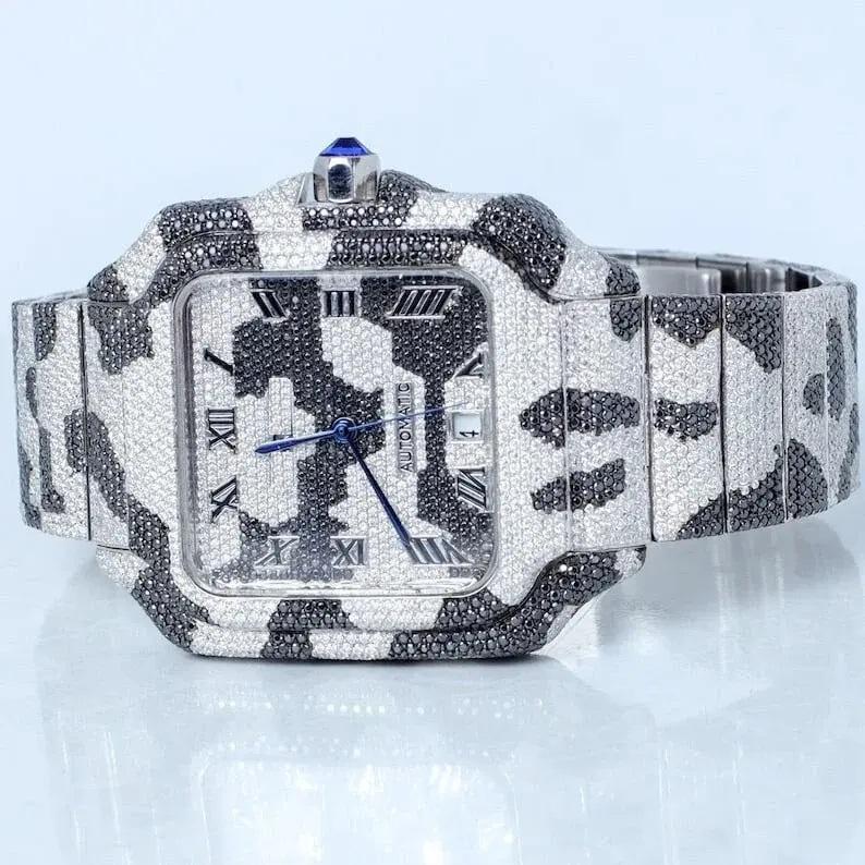 Men's Wrist Watch with Black and White Moissanite Diamond Fully Iced Out Automatic Mechanical Movement for Indian Suppliers