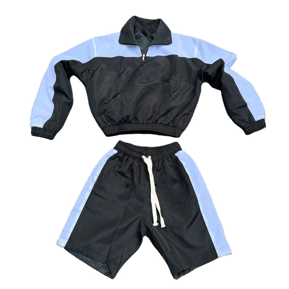 ชุดเซ็ตจ็อกเกอร์ซิปสำหรับผู้ชาย ชุดวอร์มไนลอนขาสั้น พร้อมเสื้อแจ็คเก็ตกันลมลายกราฟิกสะท้อนแสง และเสื้อฮู้ดครอป ชุดวอร์มขายาวขาสั้น