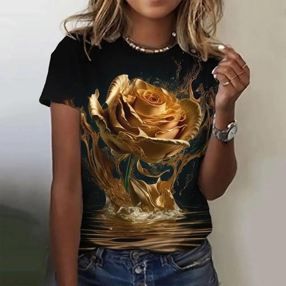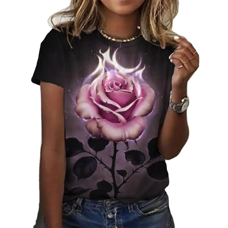 เสื้อยืดแขนสั้นผู้ชายและผู้หญิง พิมพ์ลายกุหลาบ 3 มิติ พิมพ์ลาย 3 มิติ เสื้อคอกลมแฟชั่น เสื้อเชิ้ตผู้ชายและผู้หญิง 6xl ระบายอากาศได้