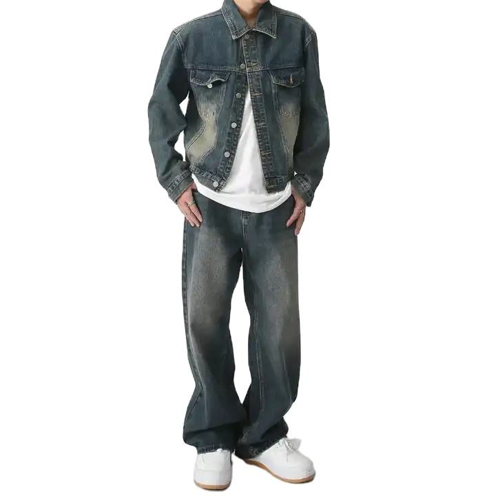 กางเกงยีนส์เดนิมทรงหลวมสำหรับผู้ชาย เอวกลาง ทรงแข็ง ซิปหน้า ขากว้าง