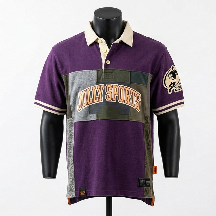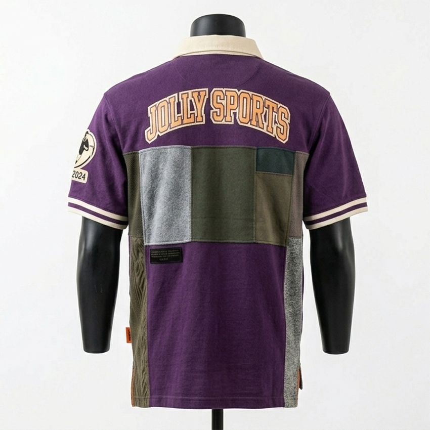 เสื้อรักบี้ผู้ชายผ้าฝ้ายพรีเมียมแบบถักสองชั้น สีม่วง เบจ เขียวมะกอก เทา แต่งแผงสีต่างกัน ปักโลโก้ตามสั่ง เสื้อรักบี้สำหรับเสื้อโปโล